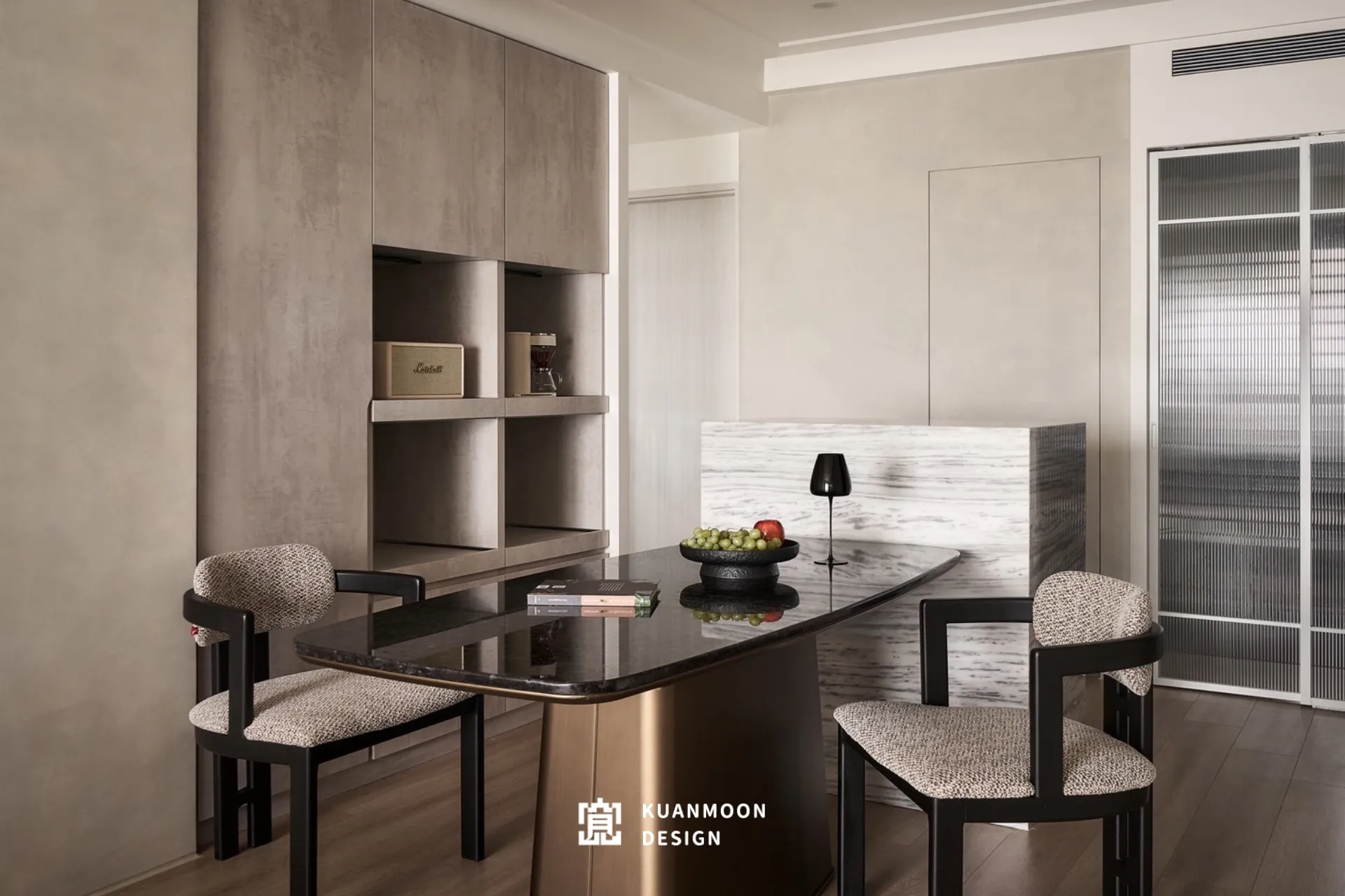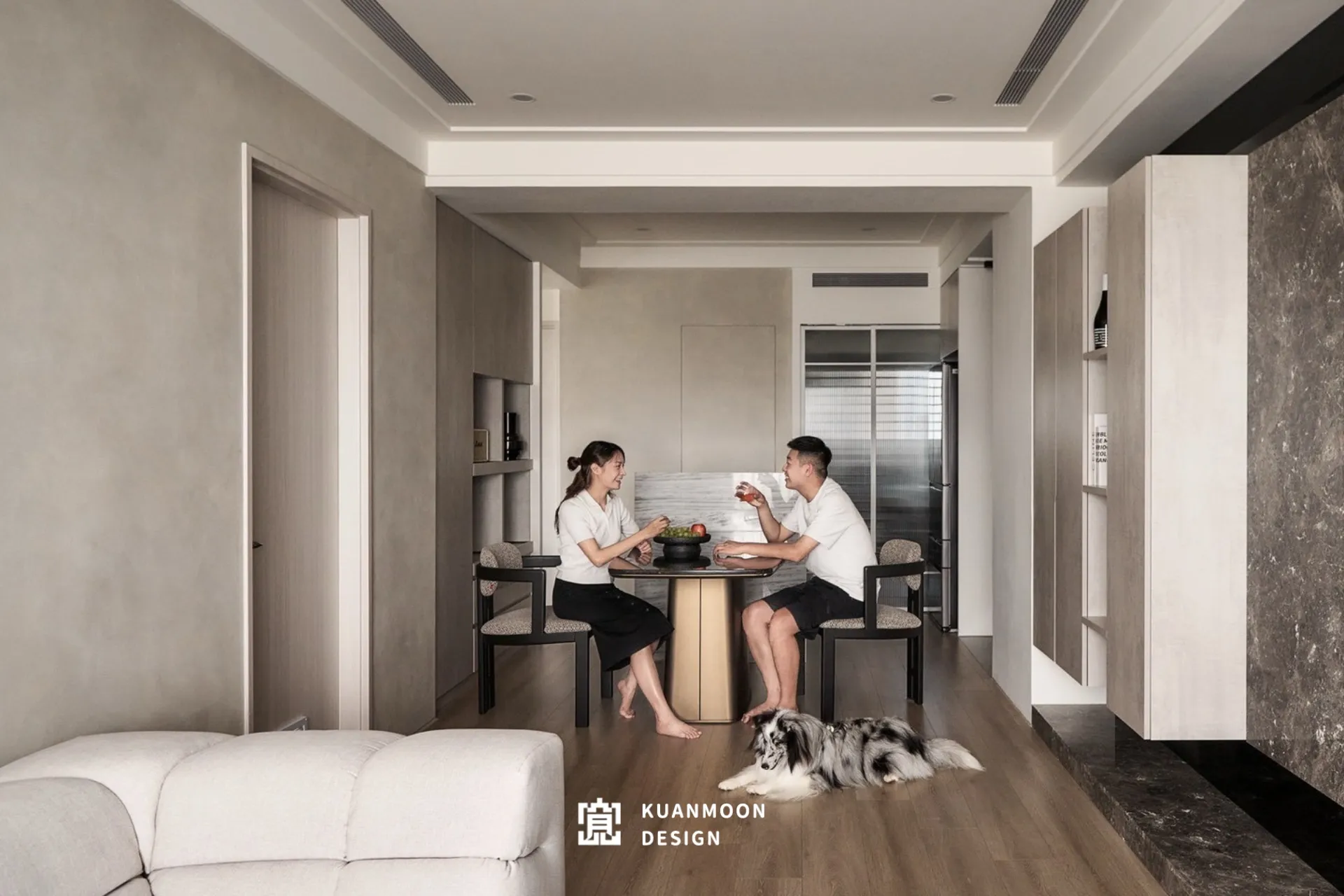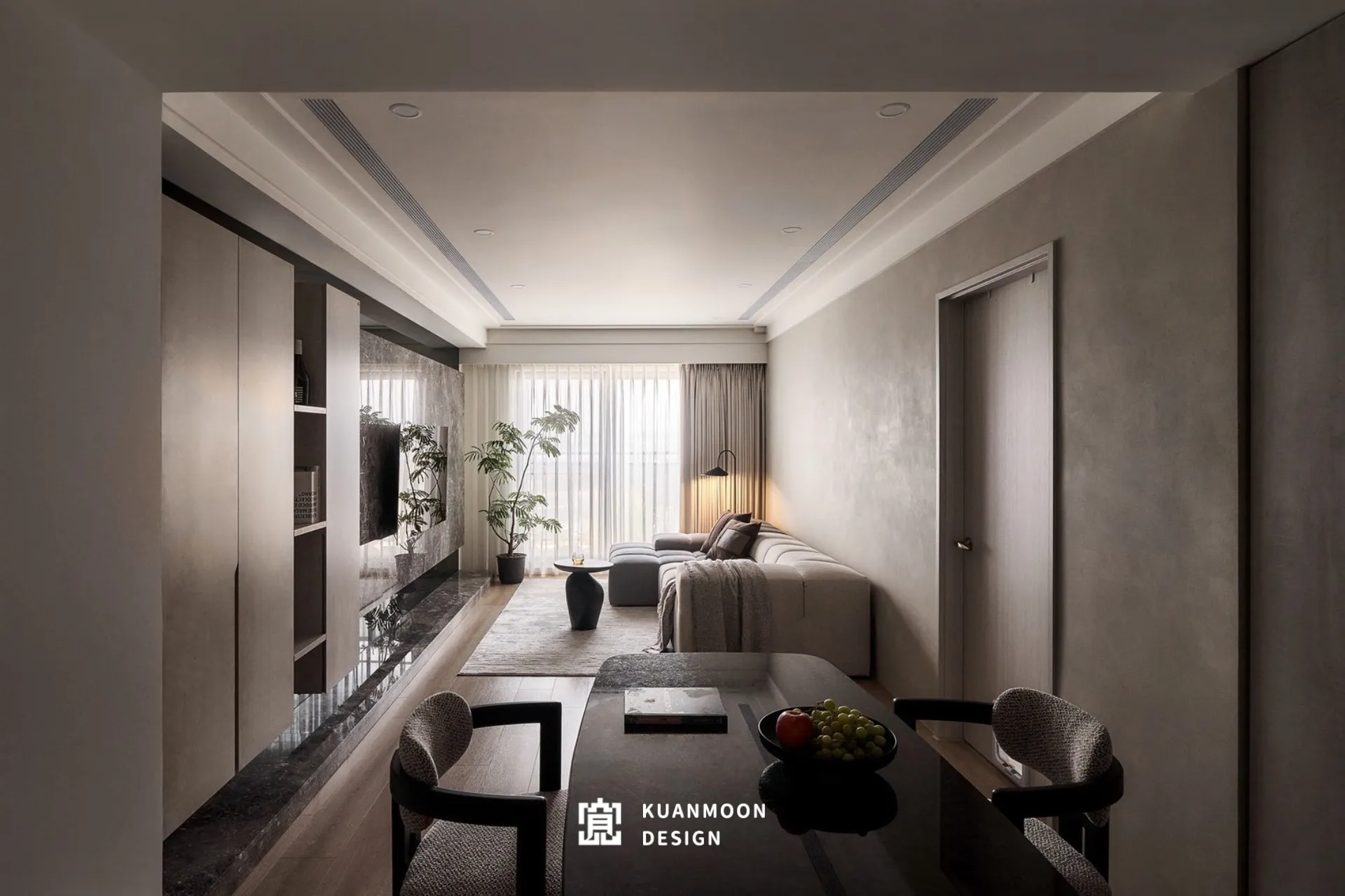 設計師透過材質與色彩的巧妙運用,營造出沈靜、舒適且具個性化的居住空間。客廳與餐廳連貫,空間開闊而流暢,讓屋主在生活中能感受到平和與放鬆。