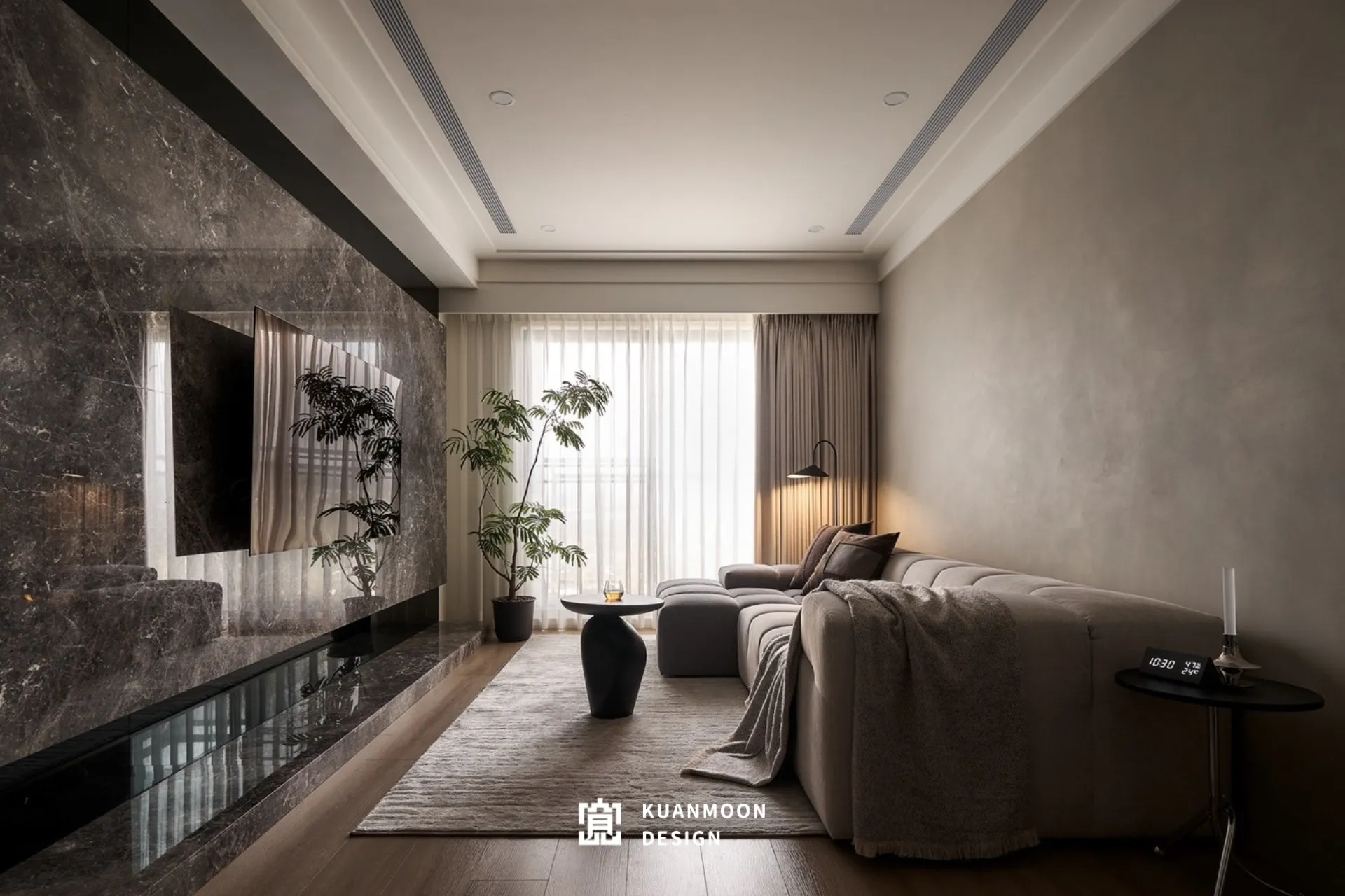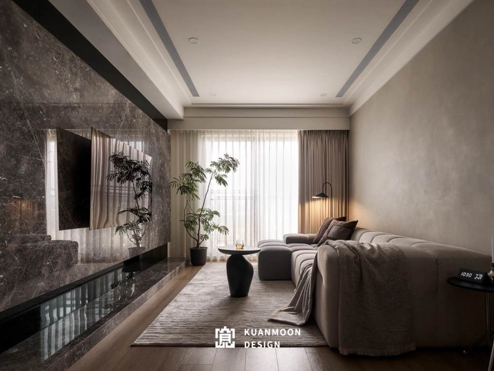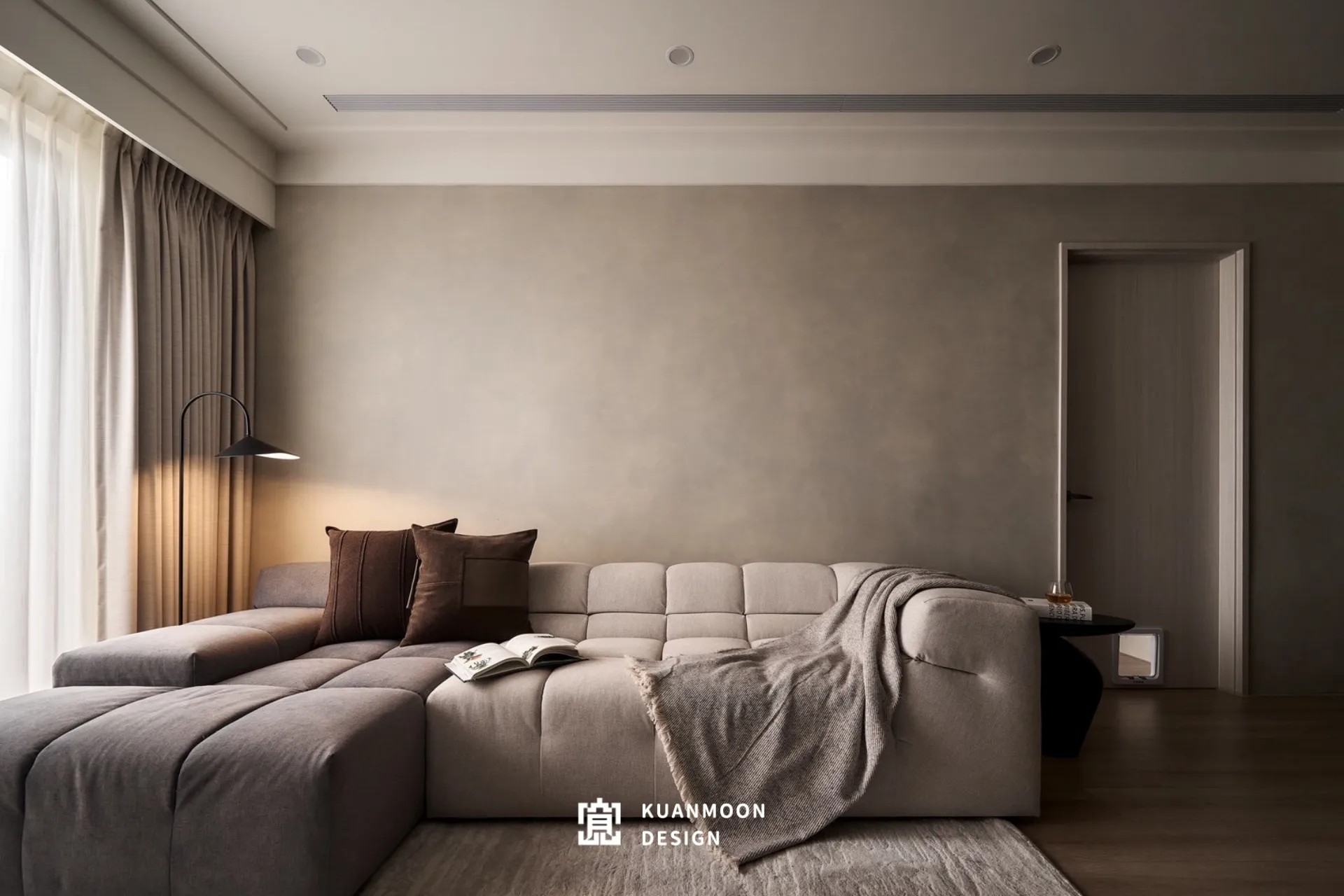 設計師透過材質與色彩的巧妙運用,營造出沈靜、舒適且具個性化的居住空間。客廳與餐廳連貫,空間開闊而流暢,讓屋主在生活中能感受到平和與放鬆。