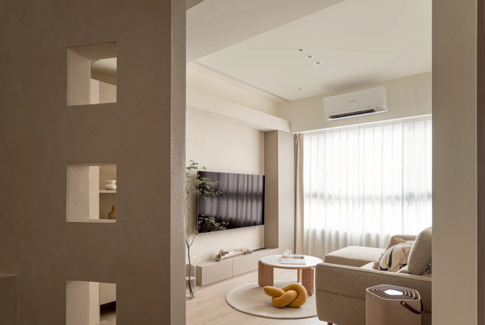 柔霧奶茶色為基底,鋪展出客廳的平靜與溫潤光線透過薄紗簾漫灑,為每一次呼吸都添上一層柔和的濾鏡