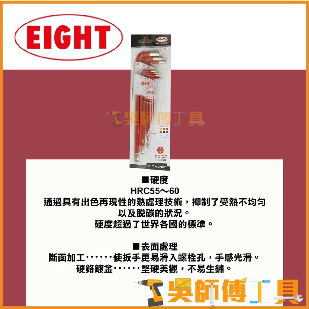 エイト株式會社,日本內六角扳手的專業生產商,採用獨家之特殊合金鋼SNCM+V,搭配EIGHT特殊的熱處理技術,使產品達到硬度與韌性的絕妙平衡,享有"重要的內六角螺栓要使用EIGHT的扳手"之評價,高品質享譽全球