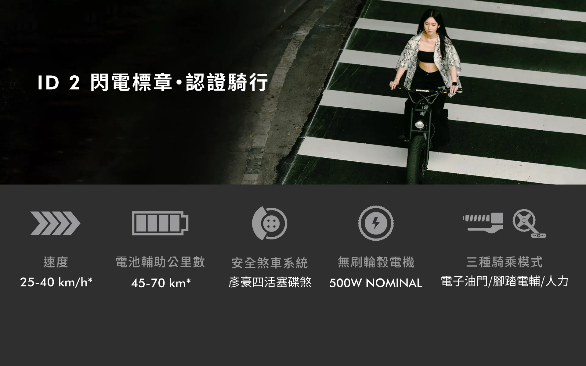 符合閃電標章安心上路,更強500w馬達、最高時速45 km/h,爬坡更輕鬆;續航提升,全新煞車系統更安全,顯示器輕鬆掌握行程數據。ID 2,為每一天注入無限精彩!