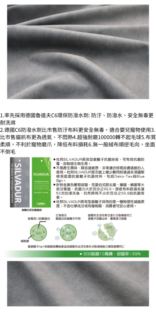 2.德國C6防潑水劑比市售防汙布料更安全無毒,適合嬰兒寵物使用3.比市售貓抓布更為透氣、不悶熱4.超強耐磨100000轉不起毛球5.布質柔順,不利於寵物磨爪,降低布料損耗6.無一般絨布順逆毛向,坐面不倒毛