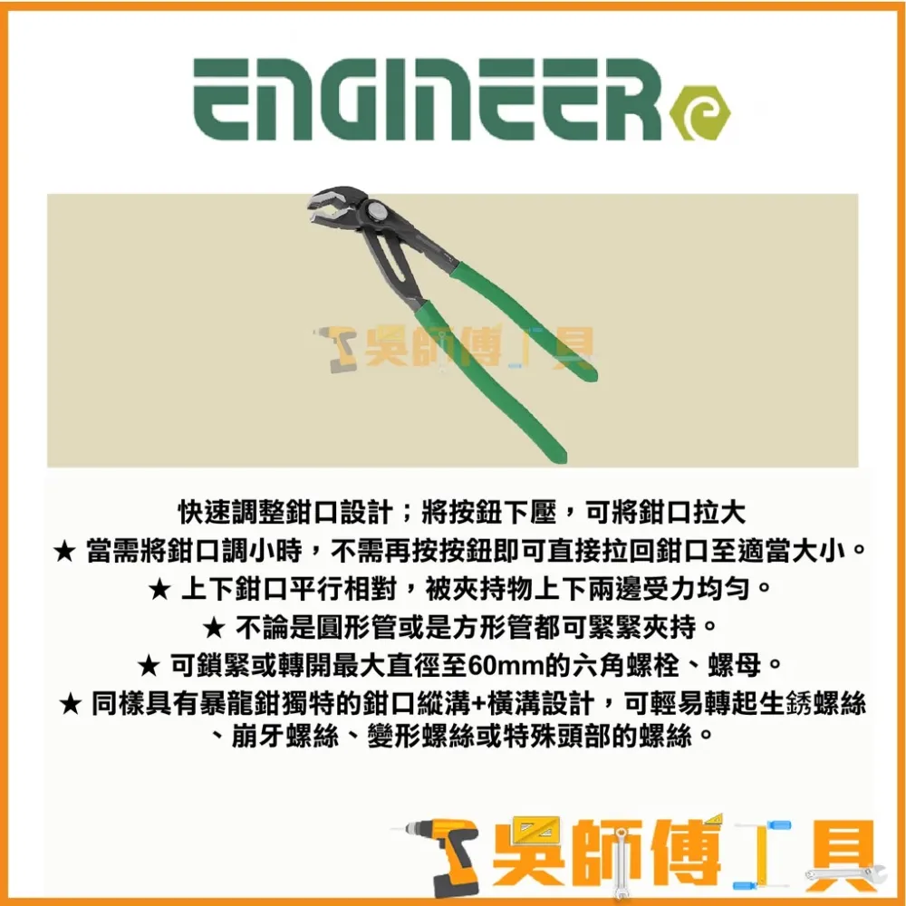 快速調整鉗口設計;將按鈕下壓,可將鉗口拉大