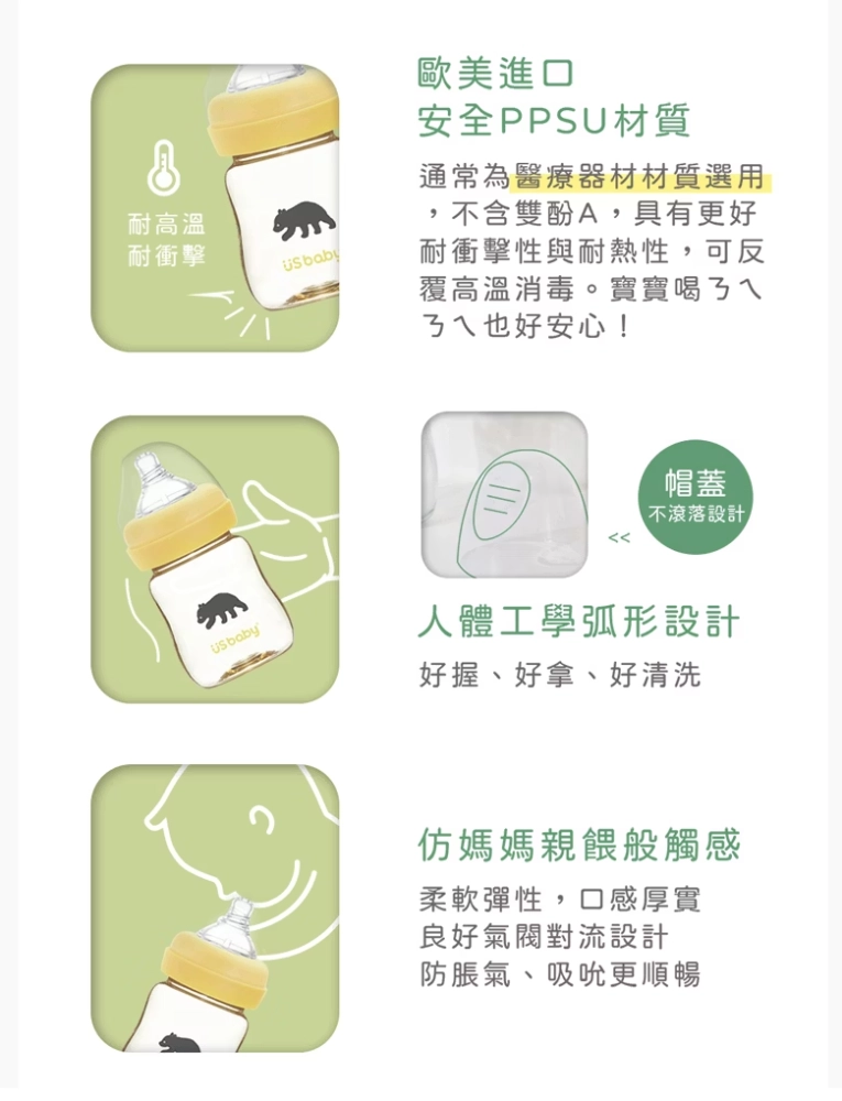 ●歐美進口安全材質:瓶身採用歐美進口安全PPSU材質,不含雙酚A,具有更好的耐衝擊及耐熱性,可承受反覆高溫消毒。