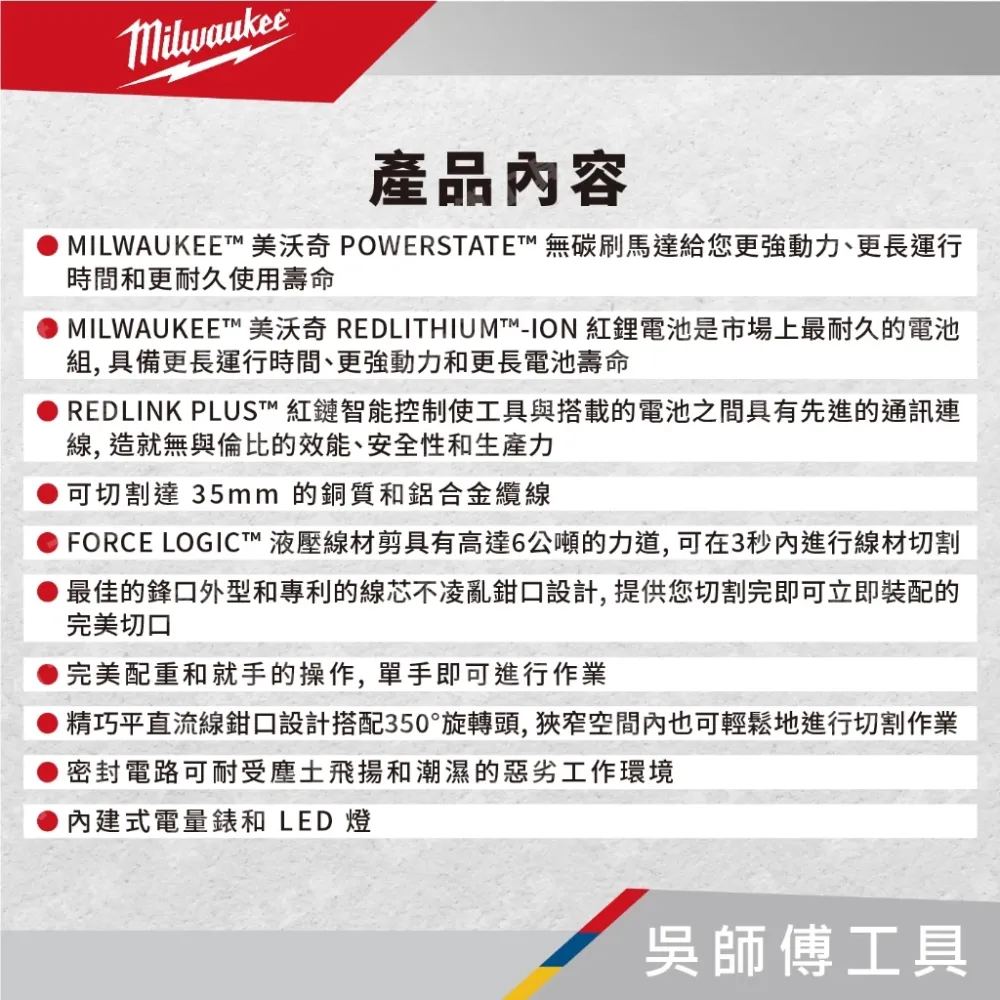 ●MILWAUKEE™ 美沃奇 REDLITHIUM™-ION 紅鋰電池是市場上最耐久的電池組, 具備更長運行時間、更強動力和更長電池壽命