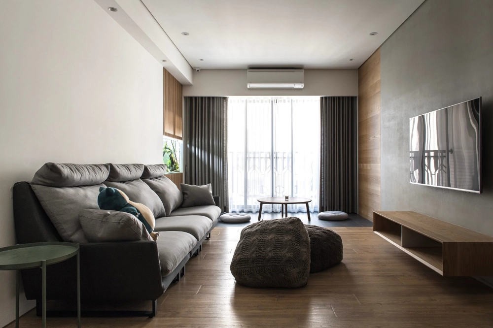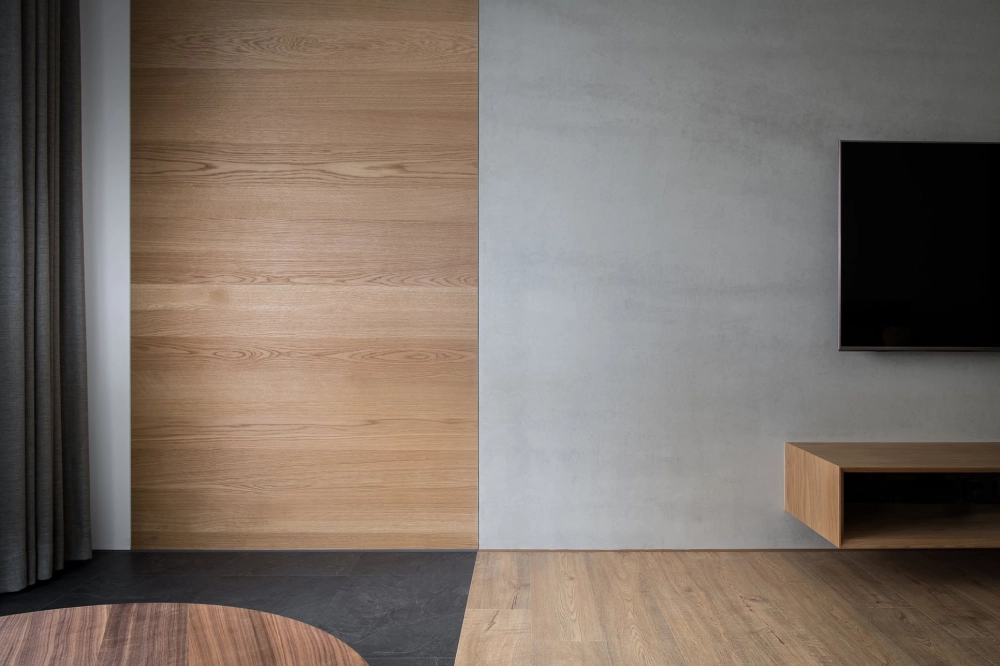 材質使用|清水模修復塗料、超耐磨木地板、毛絲面鐵件、系統板、實木皮