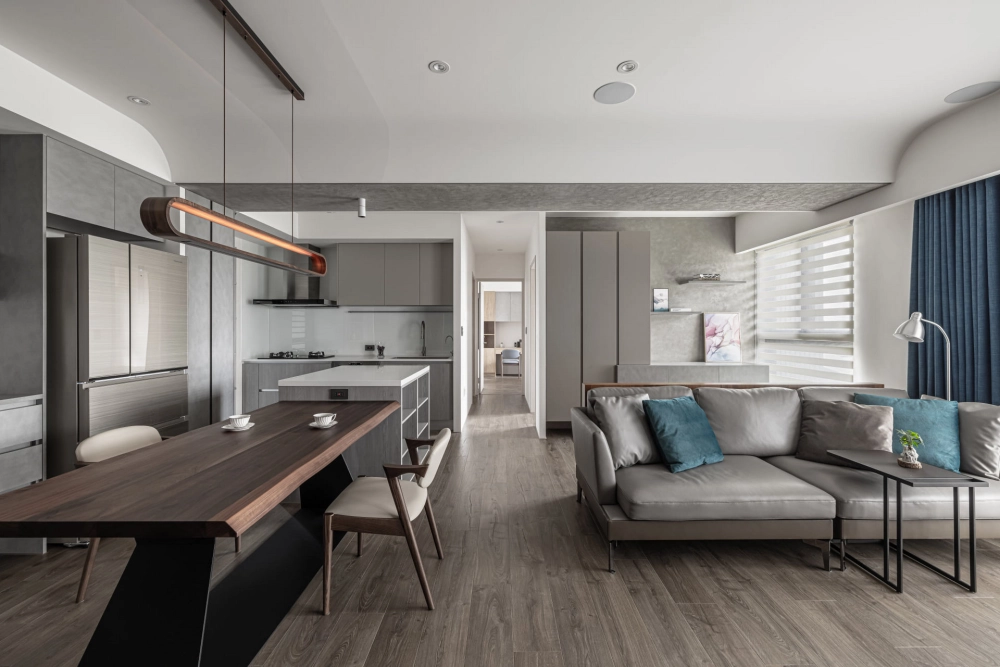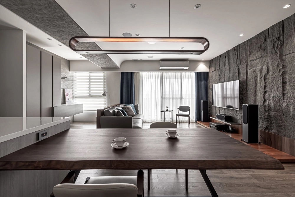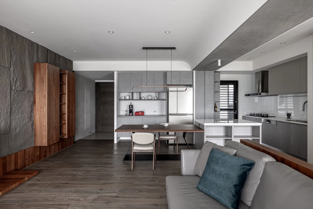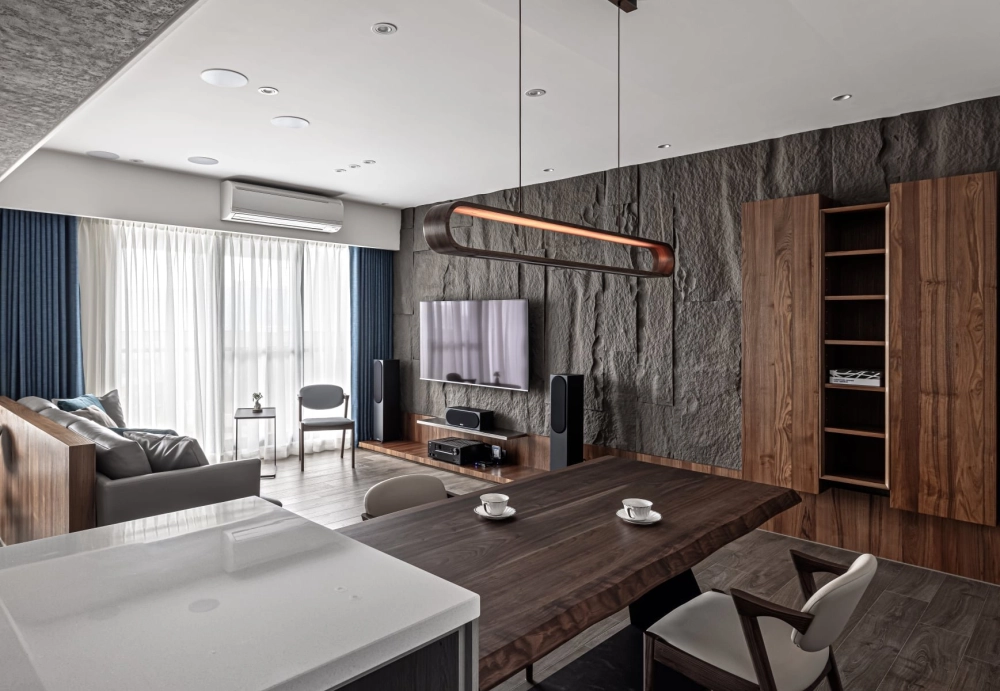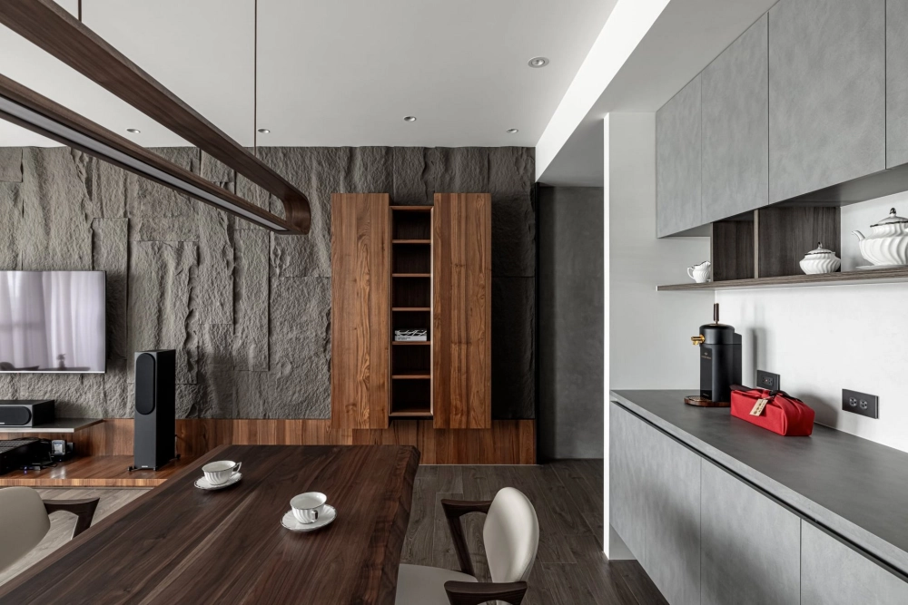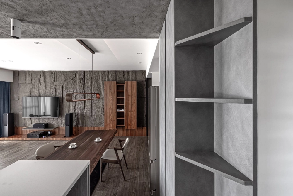 「墨染」強調空間的優點,適當附上材質點綴,除了滿足收納機能以外,更能襯托出屋主的喜好與品味。天與地的材質對比,強