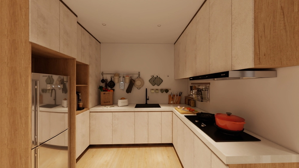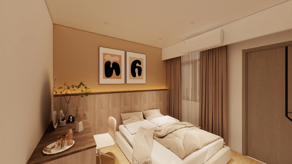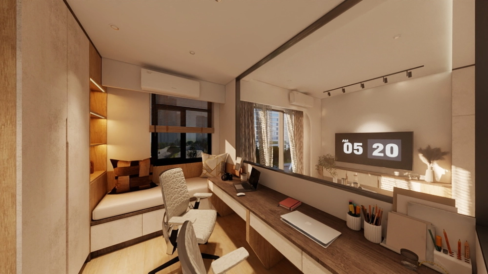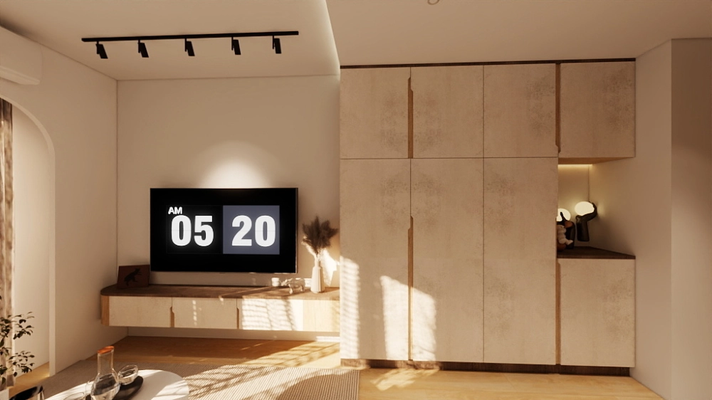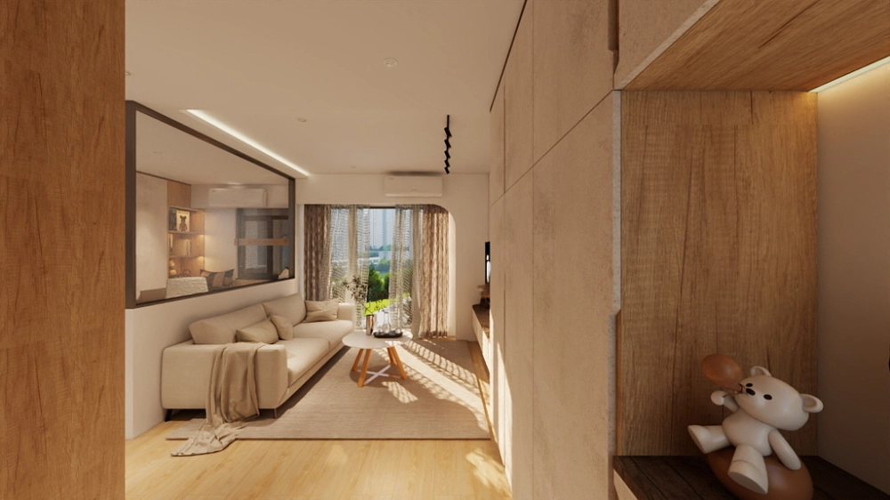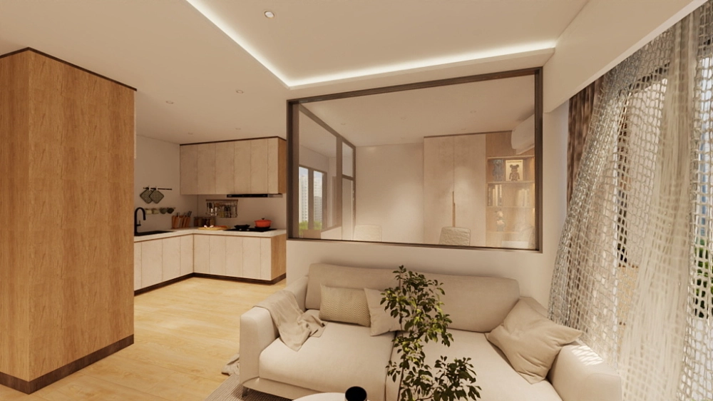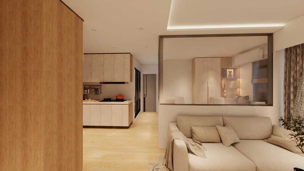 材質選用上,我們以系統櫃、木地板、乳膠漆塗料為基底,搭配情境燈條與鋁框玻璃,讓空間在質感與機能之間取得平衡。這不只是材料的選擇,更是對居住者「既要隱私、又要開闊」的真實需求的回應。