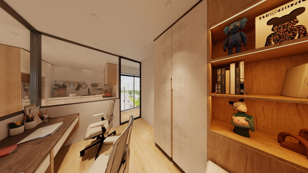 這個案子的核心,是對「視覺壓迫」的化解與轉化。邸苑透過鋁框玻璃與情境燈條的配置,讓書房工作間在感受上與客餐廳公領域合而為一,創造穿透性的空間感受。這樣的設計手法,既保有書房的獨立與隱密性,又讓整體空間在視覺上更輕盈、更和諧。