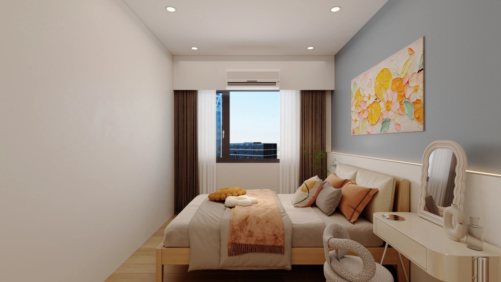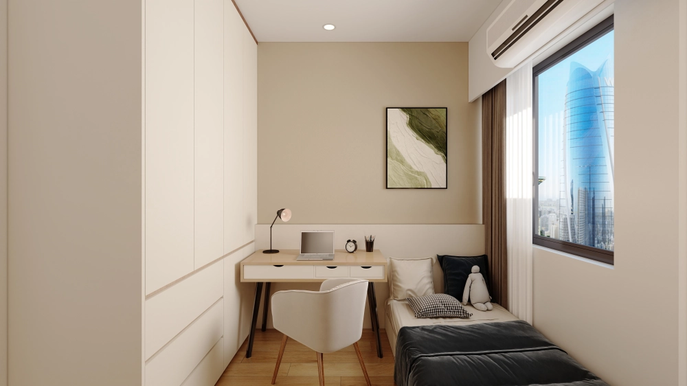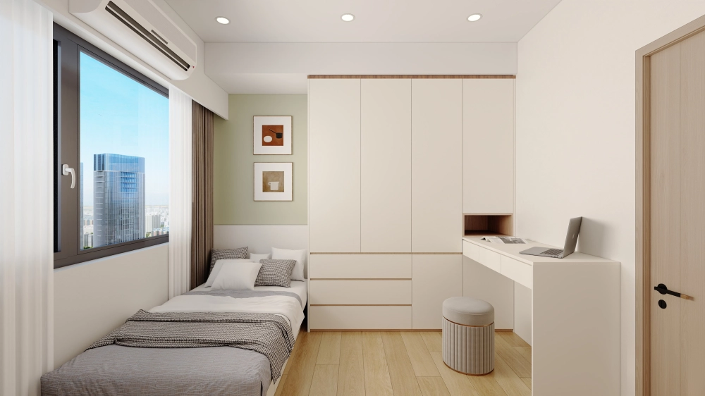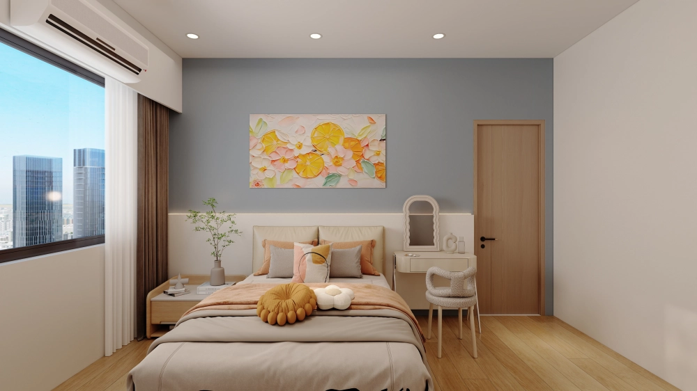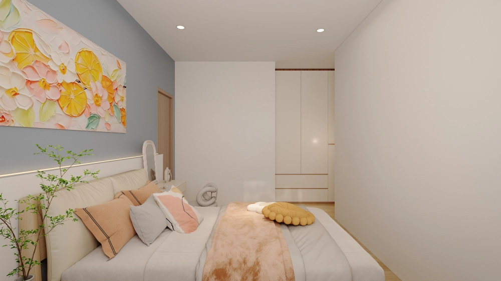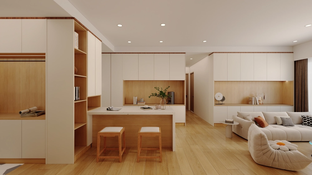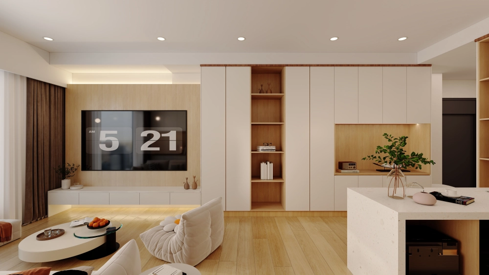 材質選用上,我們以系統櫃、木地板、乳膠漆塗料與實木皮板為主,搭配經典北歐風格配色,讓空間在視覺上清爽、在情緒上溫潤。這樣的色彩與材質搭配,不只是風格的呈現,更是對家庭痕跡與生活融亂度的包容。