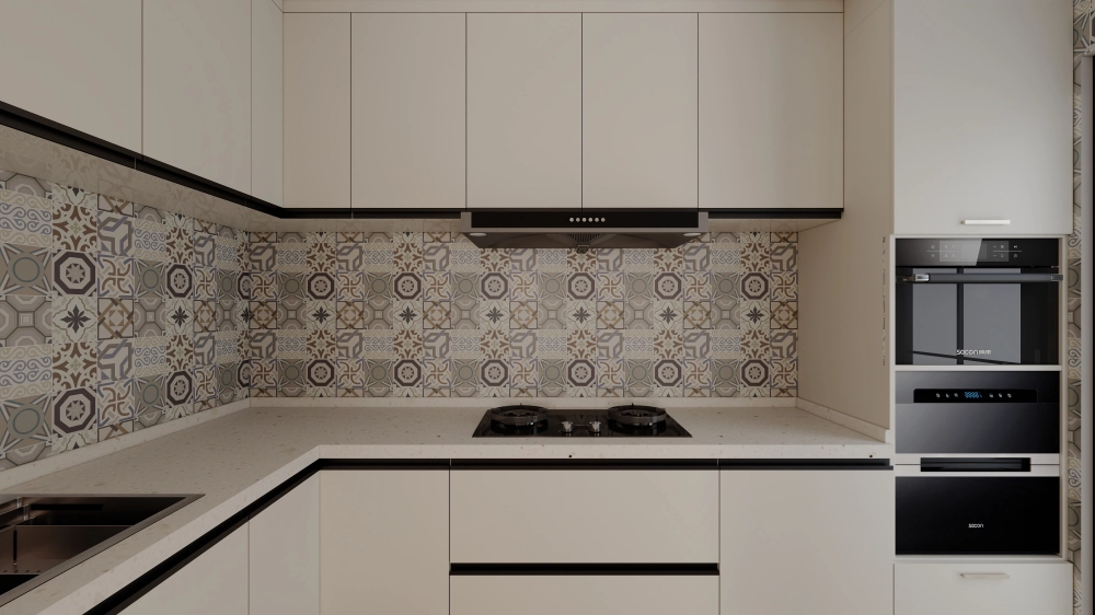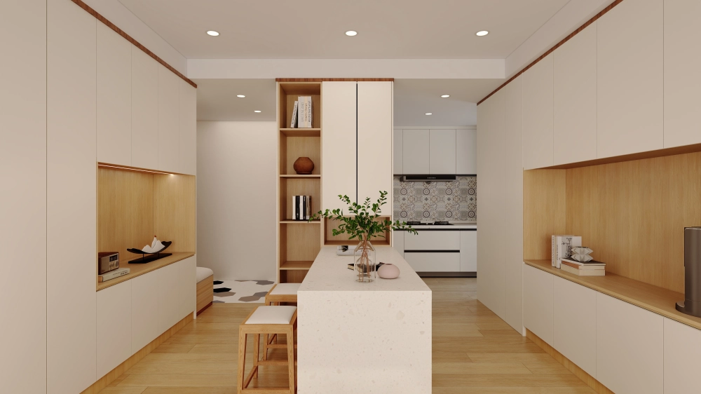 這個案子的核心,是對「公領域尷尬尺度」的化解。空間說大不大、說小不小,邸苑在中間規劃一座中島餐桌,透過位置與尺寸的精準拿捏,讓空間不再空洞或擁擠,而是剛剛好。餐桌下結合電器櫃機能,讓收納與使用更順手,也讓餐廳成為家的節奏中心。