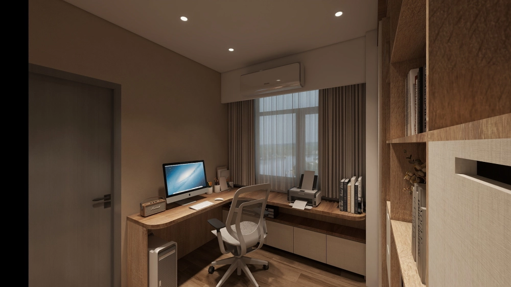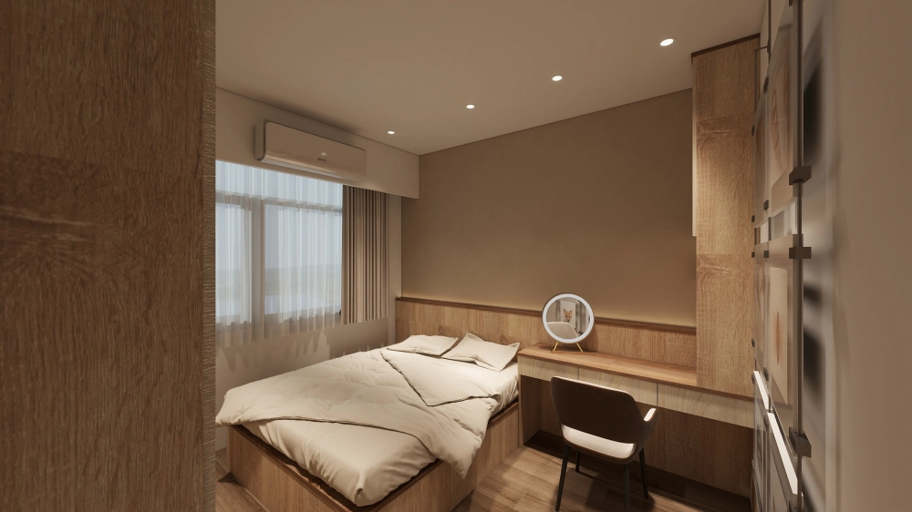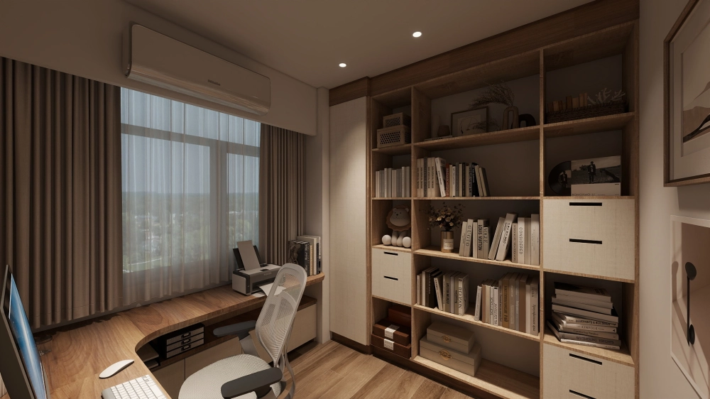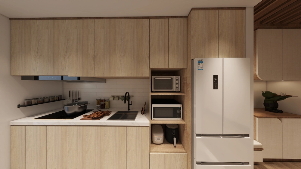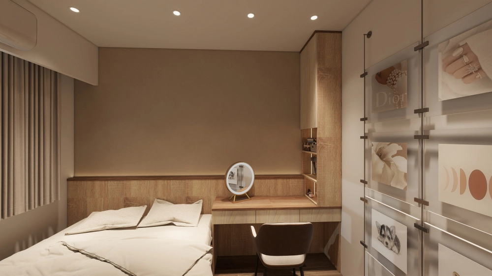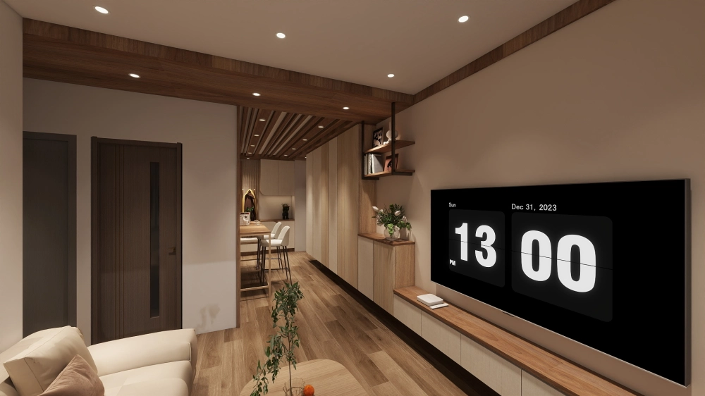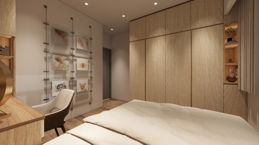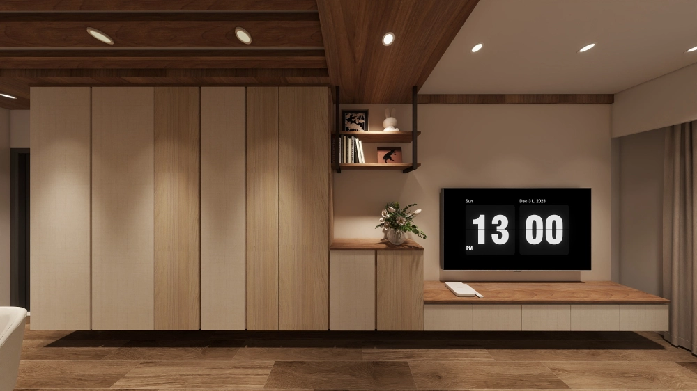 材質選用上,以系統櫃、木地板、乳膠漆塗料與實木皮板為主,搭配沉穩木紋與奶茶色調,讓空間在視覺上柔和、在情緒上溫暖。這樣的色彩搭配,不只是美感選擇,更是對「家的感受」的回應。