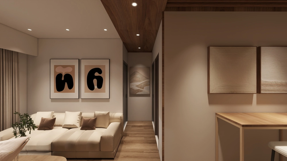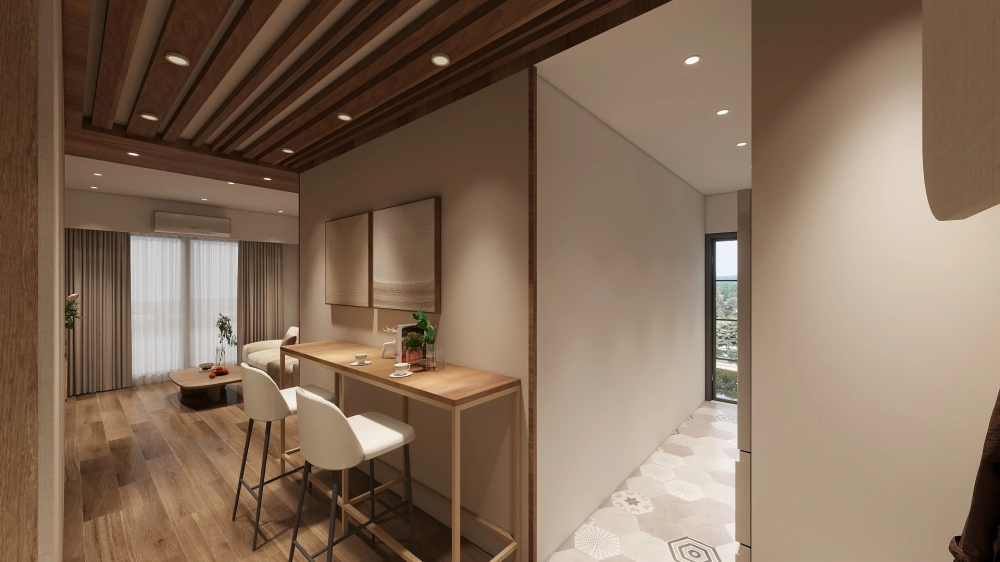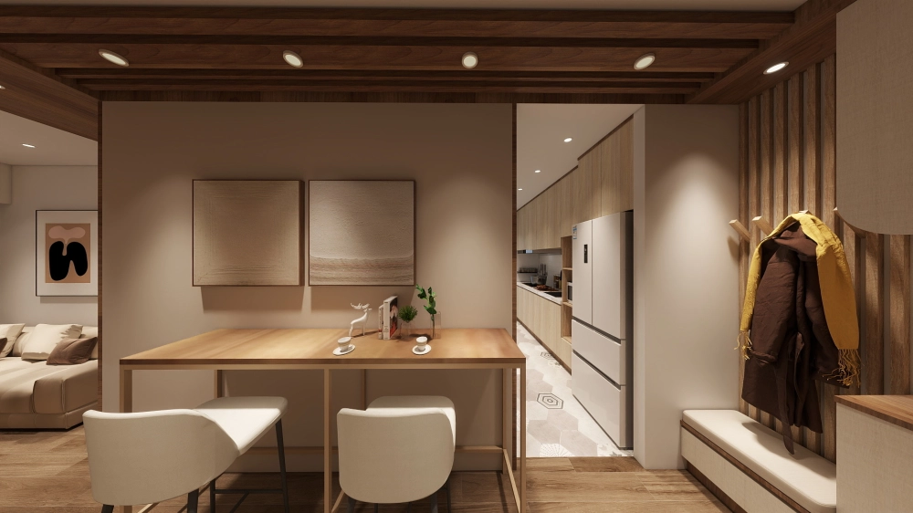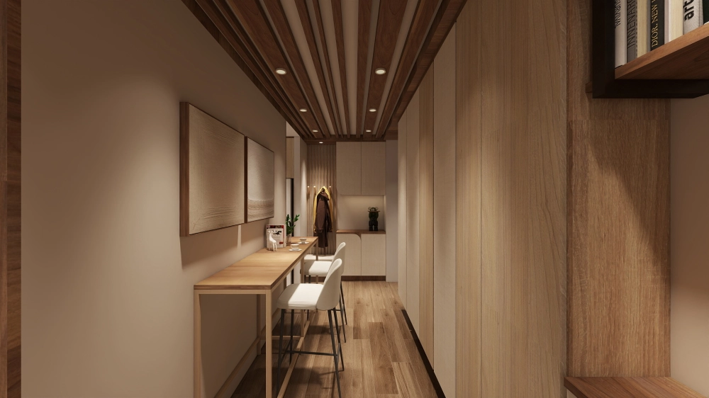 這個空間的設計核心,是對「過道」的重新定義。邸苑在玄關與走道區域,透過材質與造型的拼接,營造出氣氛感受,讓過渡空間不再只是通道,而是生活的前奏。我們在過道中加入小吧檯式餐桌,不只增加機能,也讓日常多了一份隨性與可能性。