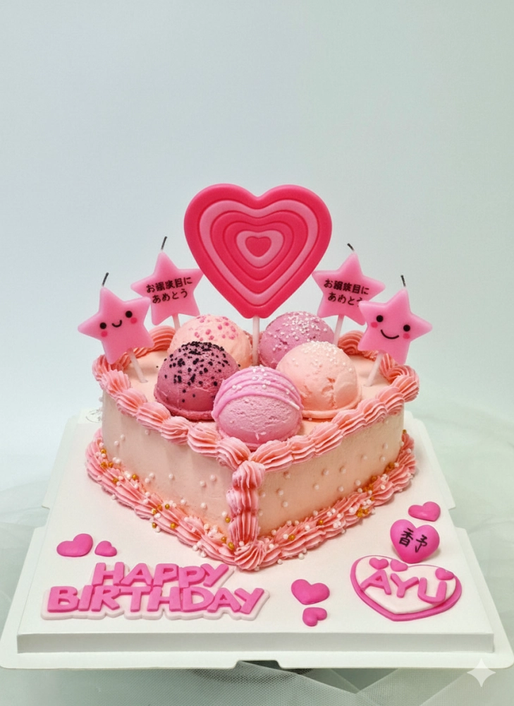 心形蛋糕象徵滿滿愛意,頂端點綴粉嫩冰淇淋球與笑臉星星燭,彷彿走進夢幻的甜點樂園。焦糖的濃香遇上覆盆子的微酸,層層堆疊出少女心的浪漫滋味💖
