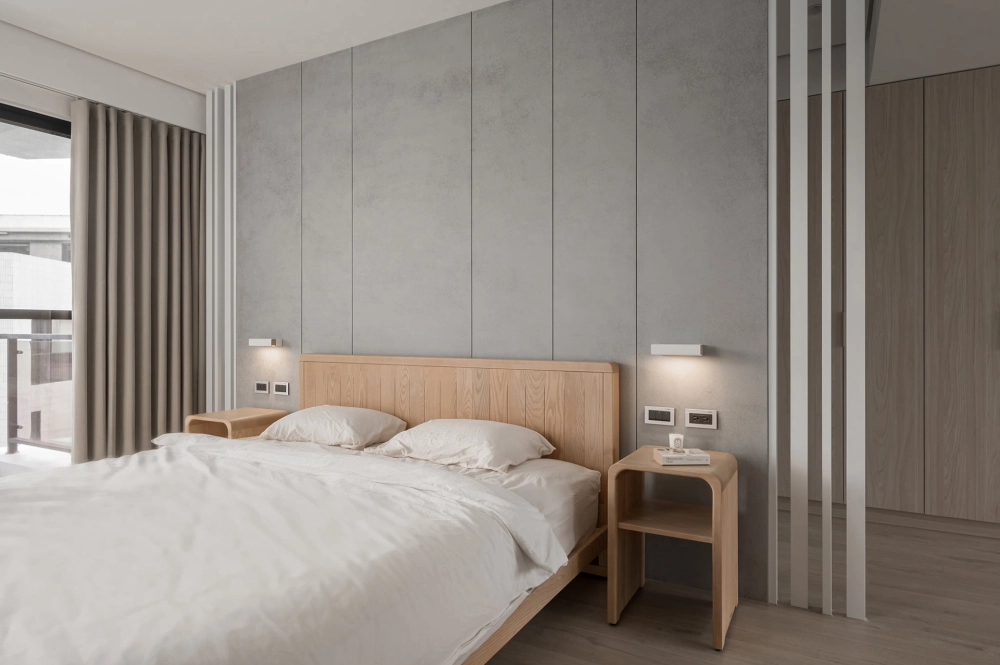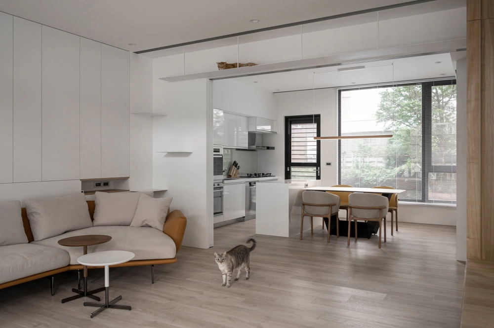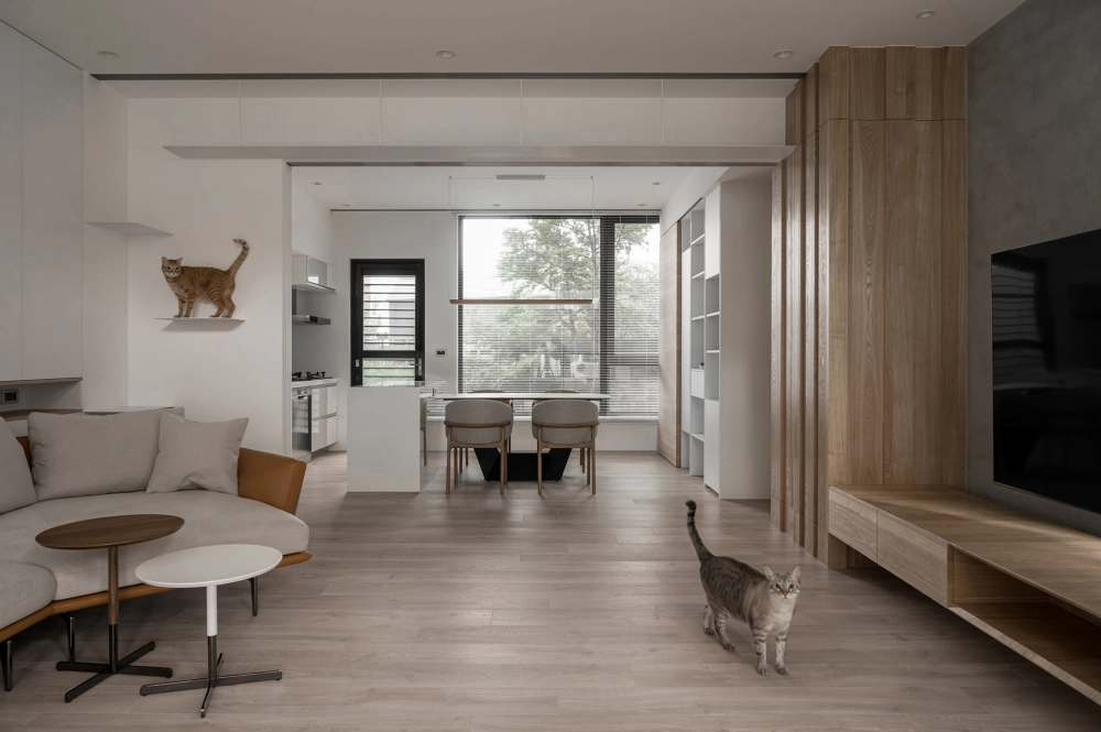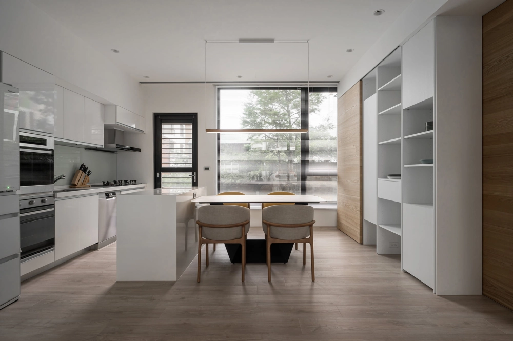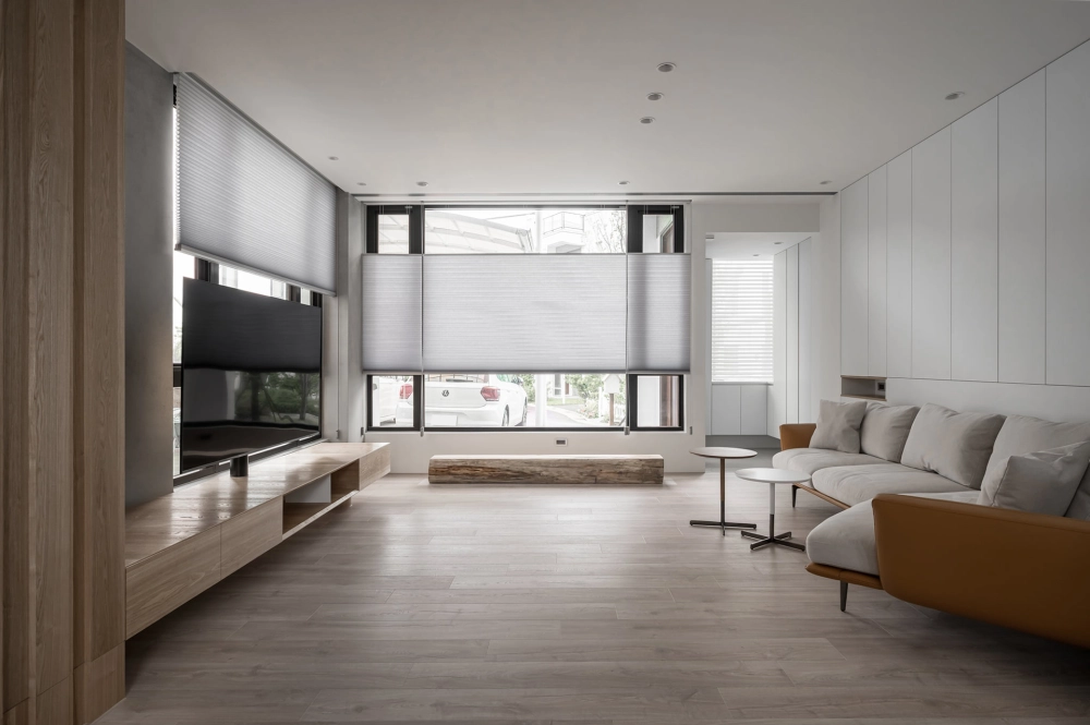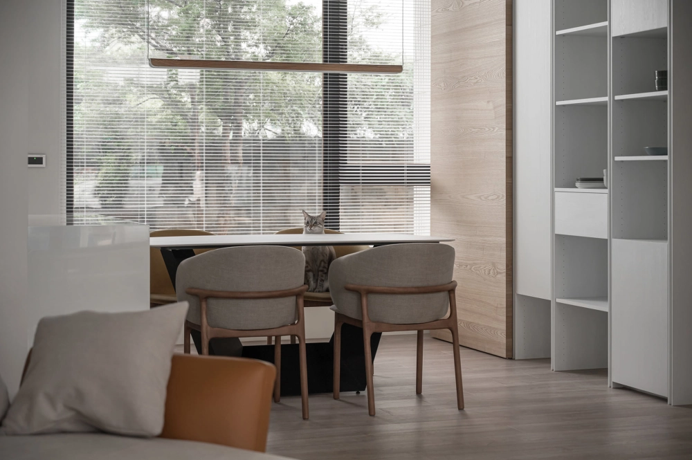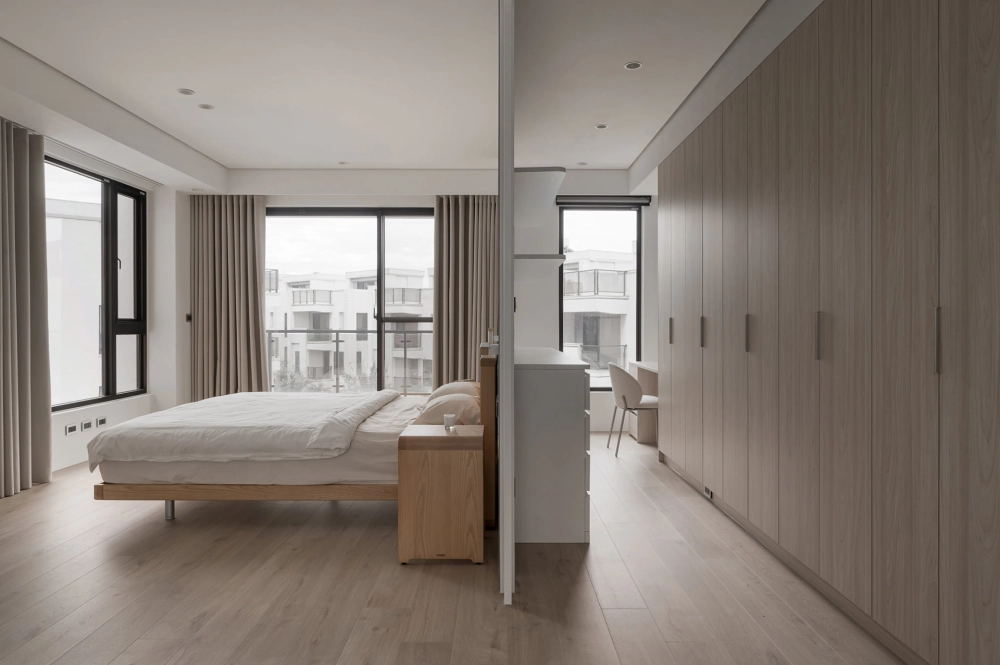 屋內搭著白與大地的暖色調,襯上灰色的重量來點綴,通透的採光面,由室外帶景入內,屋內與庭院呼應著協調的氛圍。