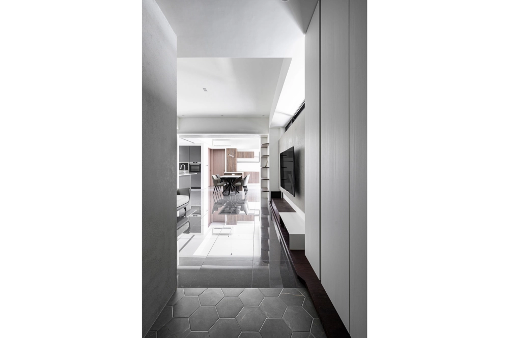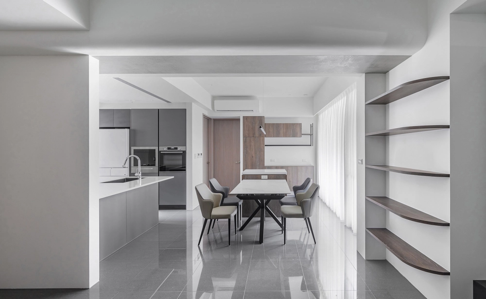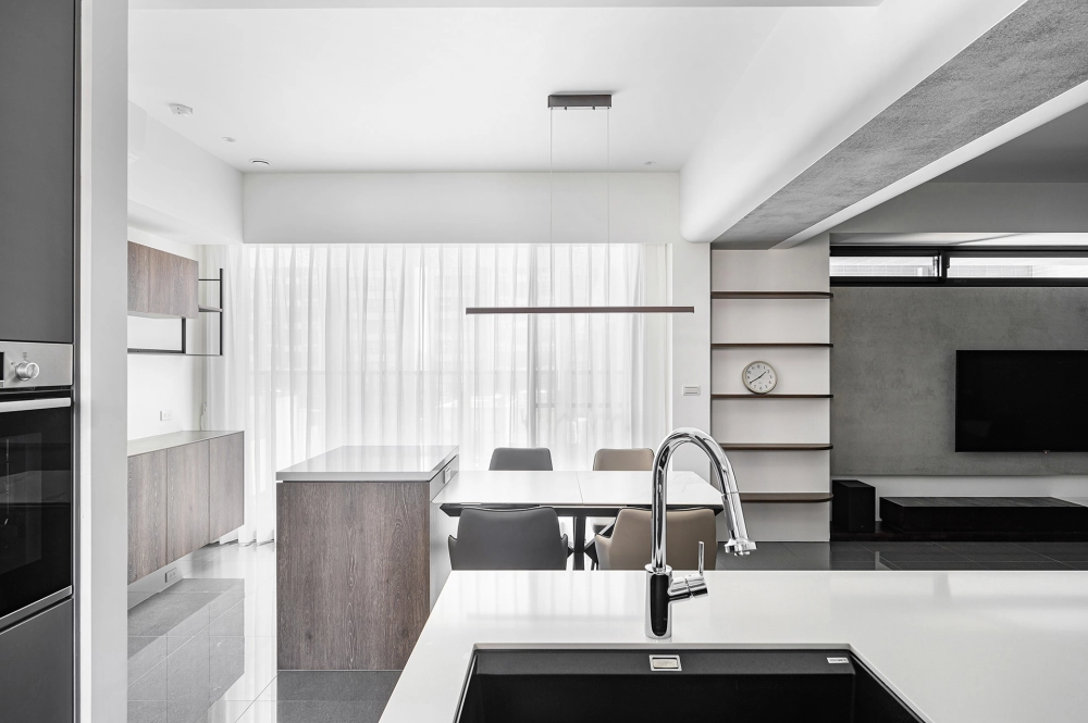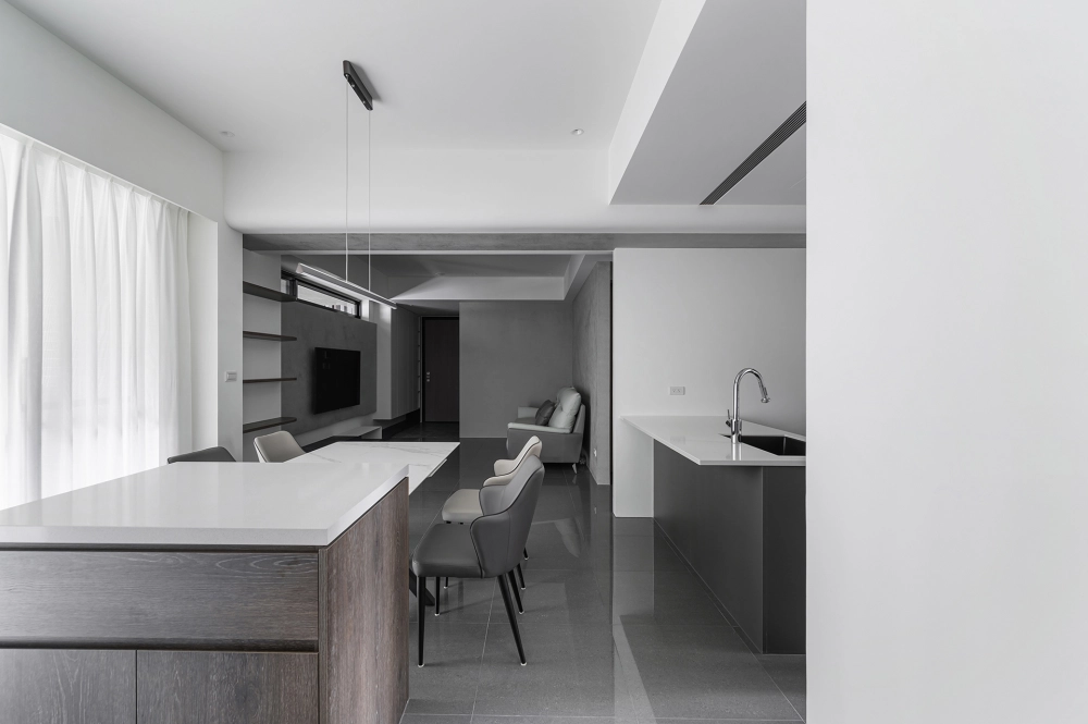 極簡的線條,修飾著原本雜亂結構 ; 簡單的黑、白、灰元素,點綴大地色系增加空間的層次感,雖為冷調卻也不失雅靜。