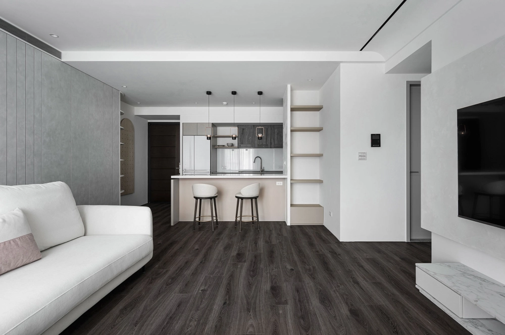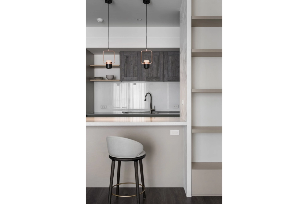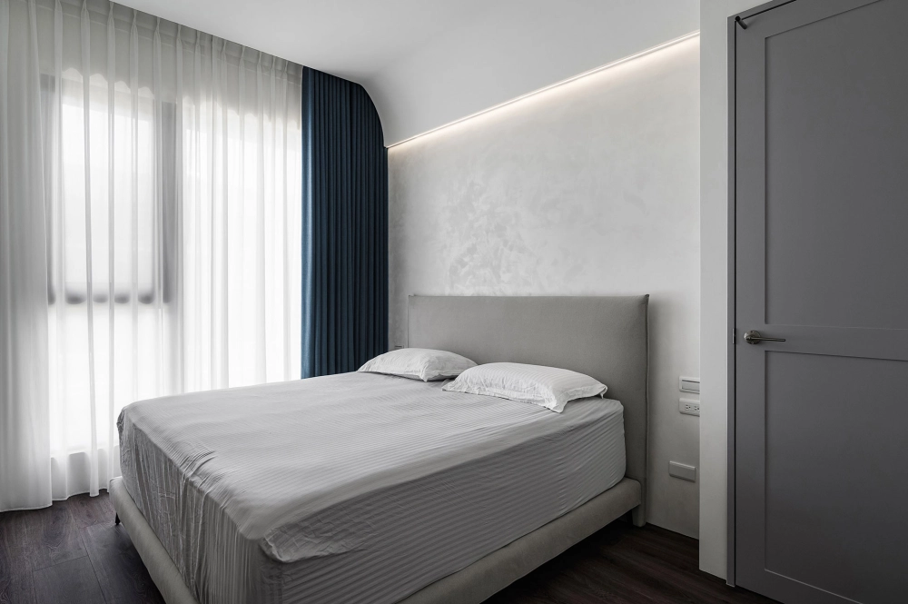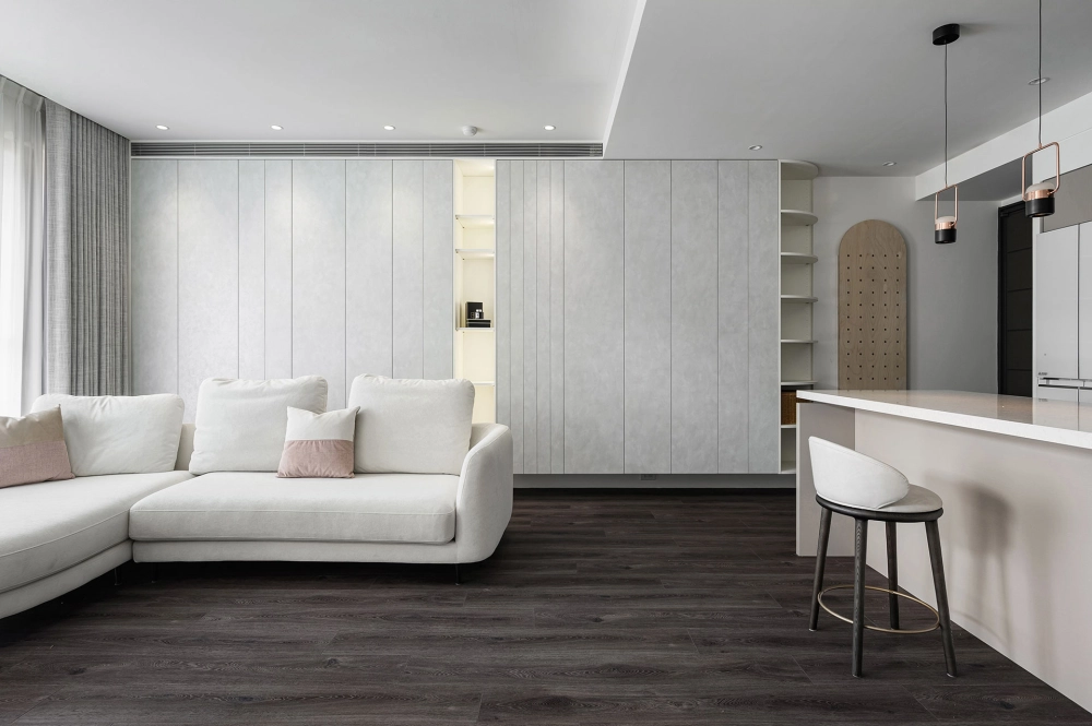 白色與灰色的主色交織,詮釋出現代極簡的平靜氛圍。硬體線條強調流暢延伸,再與其搭配家具軟件的動線,沒有多餘的贅飾,突顯空間的清爽感,使整體氛圍舒適減壓。