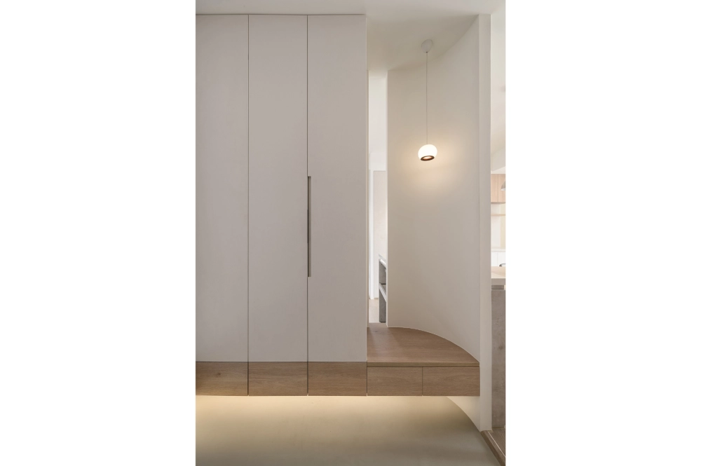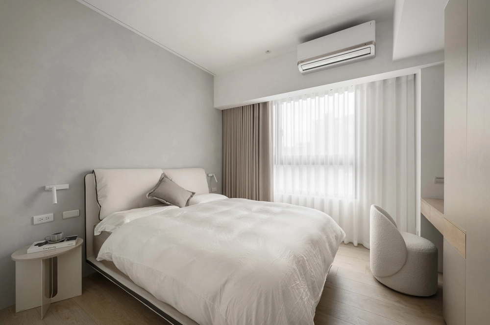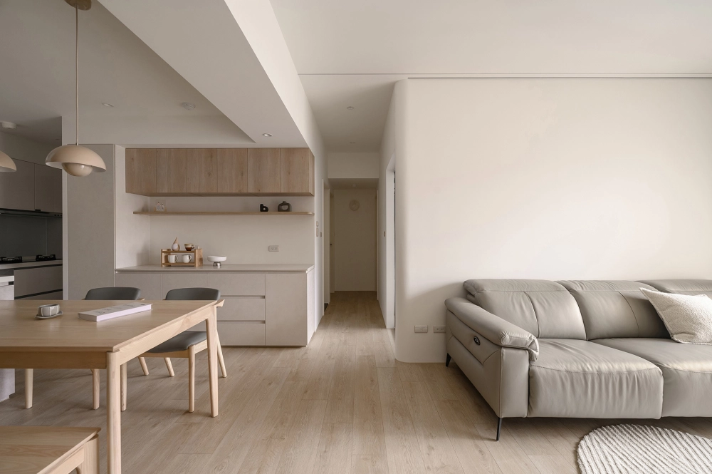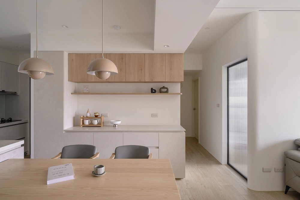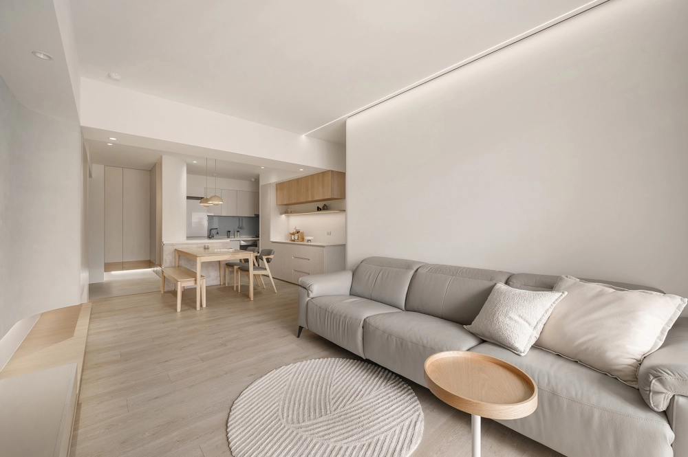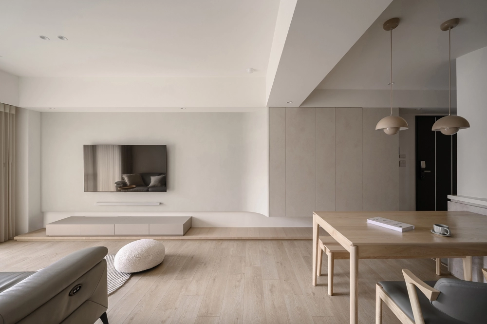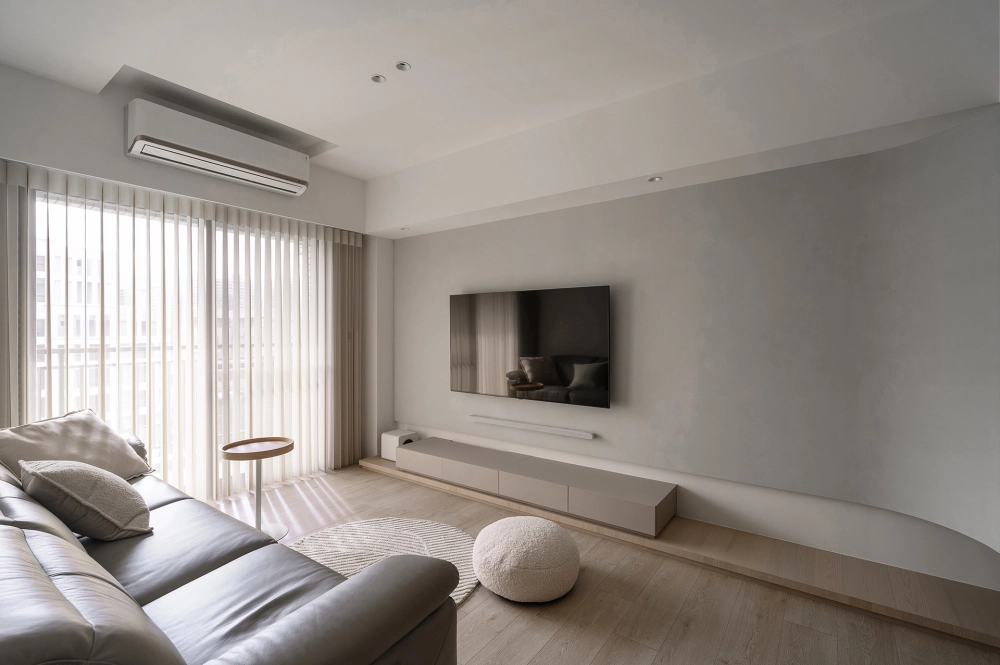 有別於以往偏重色系的極簡仛寂風格,將留白意境的精神保留。大面積牆面使用淺暖色系的塗料,淺灰白藝術塗料做精神點綴;剛硬的線條中,勾出修飾的弧線,讓俐落的線軸得到更完美整合。