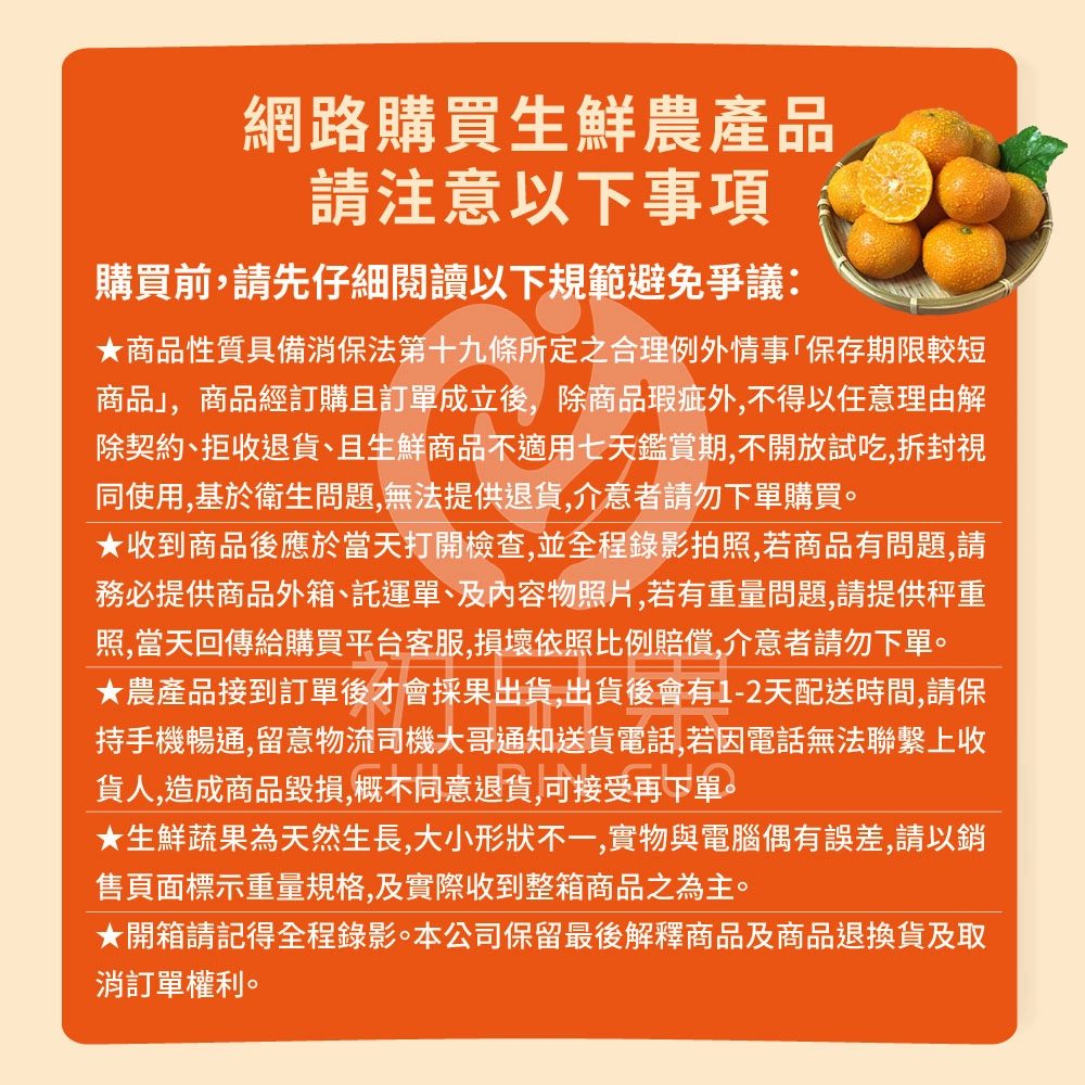 網路購買生鮮農產品請注意以下事項: 1.商品性質具備消保法第十九條所定之合理例外情事「保存期限較短商品」, 商品經訂購且訂單成立後, 除商品瑕疵外,不得以任意理由解除契約、拒收退貨、且生鮮商品不適用七天鑑賞期,不開放試吃,拆封視同使用,基於衛生問題,無法提供退貨,介意者請勿下單購買。 2.生鮮水果反覆寄送易造成損壞.任意拒收所產生的運費及商品損壞費用.概由消費者承擔支付,下單前請三思.有需要再購買。 3.收到商品後應於當天打開檢查,並全程錄影拍照,若商品有問題,請務必提供商品外箱、託運單、及內容物照片,若有重量問題,請提供秤重照,當天回傳給購買平台客服,損壞依照比例賠償,介意者請勿下單。 4.農產品接到訂單後才會採果出貨,網頁出貨時間僅供參考.請以水果實際成熟採收日期為主.若對日期很在意的人.請不要下單。 5.商品出貨後會有1-2天配送時間,請保持手機暢通,留意物流司機大哥通知送貨電話若因電話無法聯繫上收貨人,或收件人配送地址填錯.造成商品毀損,概不同意退貨,可接受再下單。 6.生鮮蔬果為天然生長,大小形狀不一, 視產地狀況而定有時候會自動升級為大果.粒數會減少.實物與電腦偶有誤差,請以銷售頁面標示重量規格,及實際收到整箱商品之為主。對於粒數比較堅持的客人請不要下單。 7.開箱請記得全程錄影。本公司保留最後解釋商品及商品退換貨及取消訂單權利。