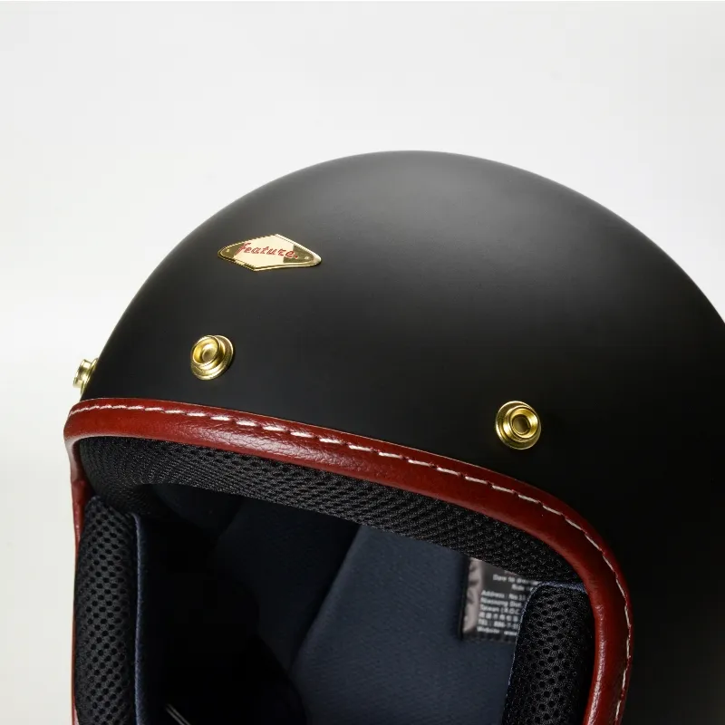 DEREK Ⅲ 再度掀起屬於自由靈魂的復古搖滾風潮,延續本系列一貫的 高雅與力量象徵,每一款配色,都能輕鬆展現你穩重而精緻的騎乘品味。新款採用 銅洗黃金色五金配件、後頸真皮飾帶設計,延續 Feture 最具代表性的乳膠皮革縫入帽殼之工法技術,看似簡約的復古外型之下,蘊藏叛逆靈魂與現代細節的平衡。
