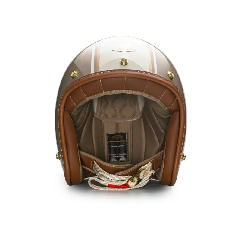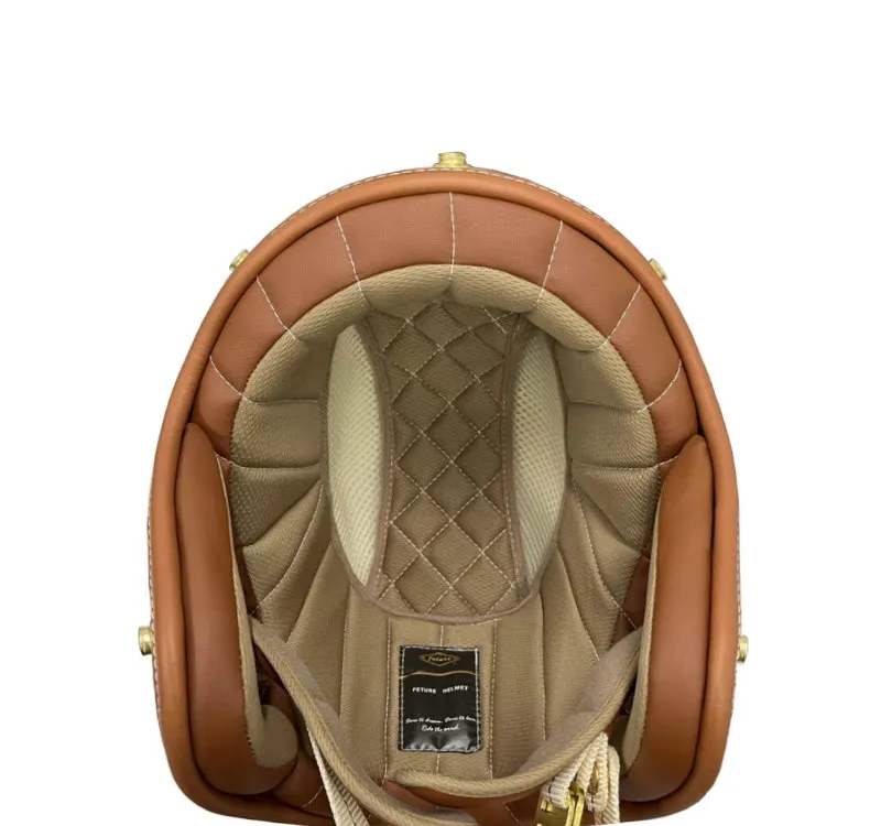 GODEN新帽體系列將復古視覺化,拉長帽體,修飾頭型,不顯寬臉,整頂帽款所到之處盡是帥美,GODEN不只是一頂精緻的安全帽,集聚職人正小牛皮縫製邊條,逐頂用心黏貼,細膩手工總是美好,作品充滿著溫度與手感,背後有這麼一段為您創造的能量,即是戴FETURE該有的酷帥本格味。