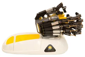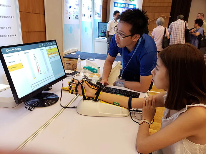 * 穿戴式手部支具,配合2個表面肌電(sEMG)感測器,固定於前臂伸肌與屈肌,用於偵測隨意運動的電信號。