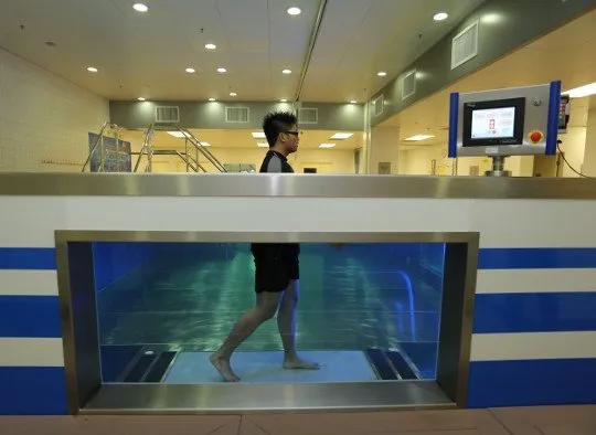 * 水下跑步機能在泳池內進行固定位置的步行訓練,治療師可清楚觀察病人水下的動作
