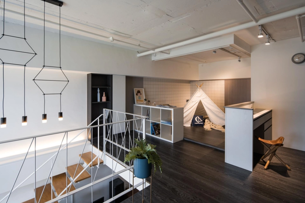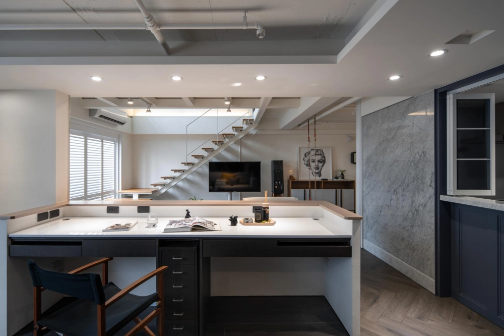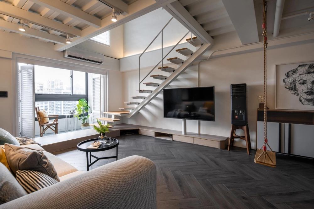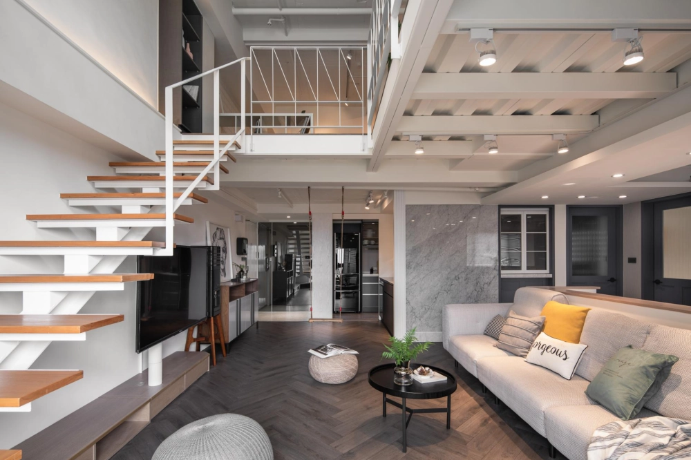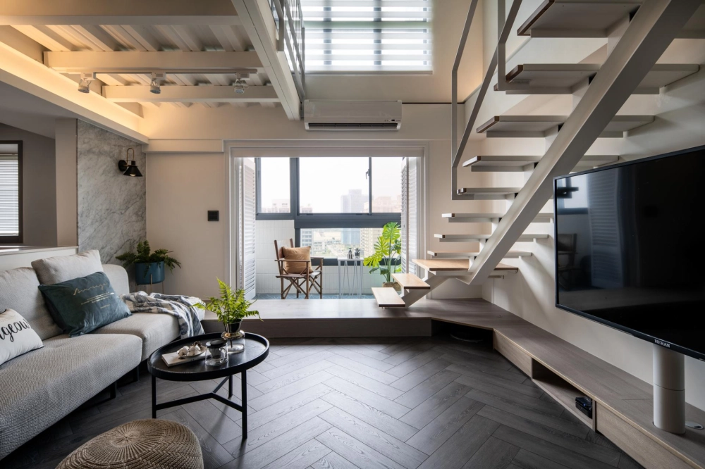 The duplex residence boasts extraordinary natural light. The designer cleverly transformed “light” into the soul of the space. Upon entering, the view extends into the living room and the window-side daybed, as the layered circulation design ensures every area is bathed in bright, soft natural light. The staircase was boldly reoriented so that it no longer merely connects the floors—it integrates seamlessly with the TV wall and couch, emerging as a highlight brimming with aesthetic tension. Constructed from perforated steel panels, the staircase significantly enhances the overall brightness.