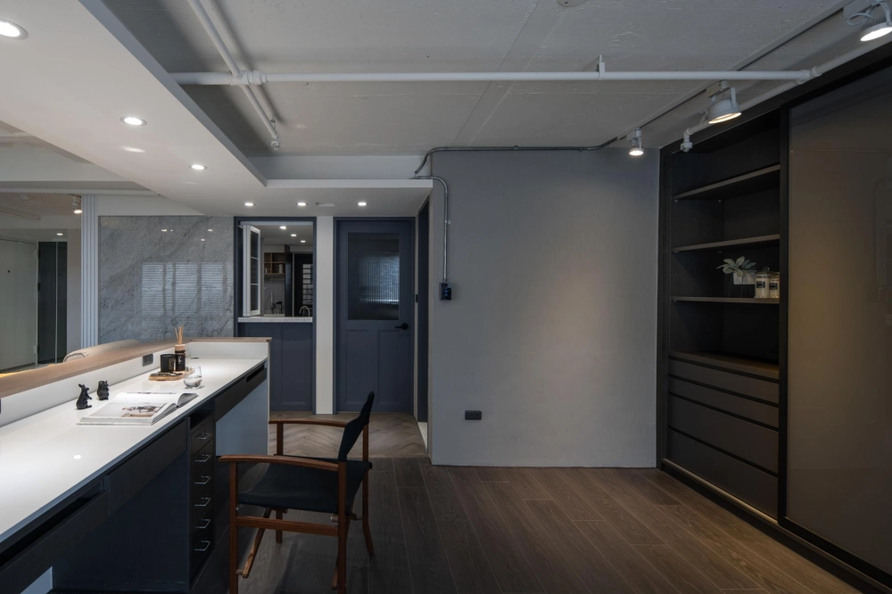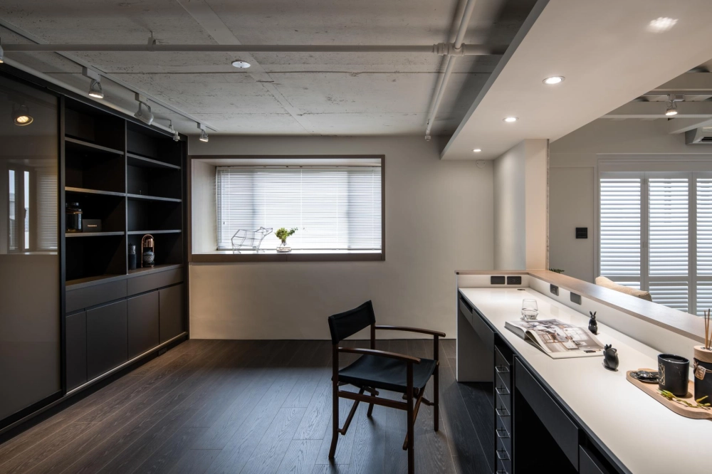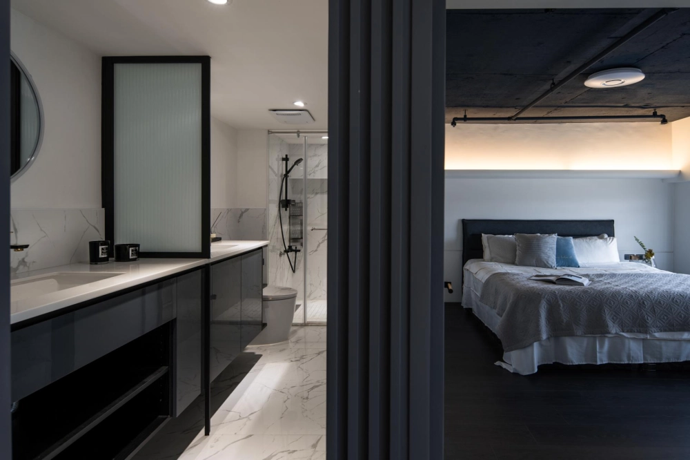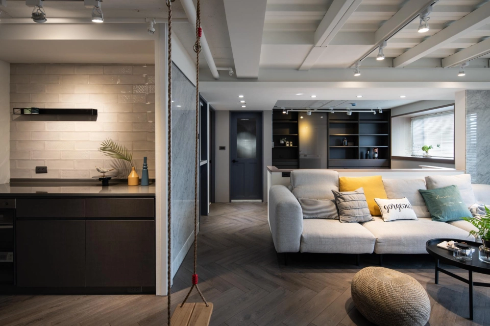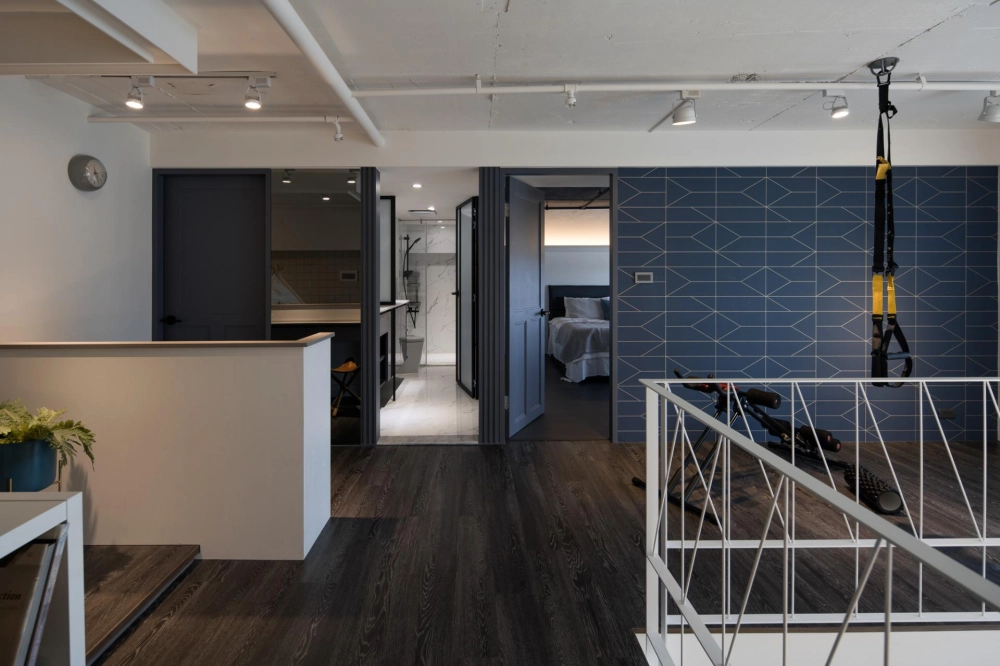 The duplex residence boasts extraordinary natural light. The designer cleverly transformed “light” into the soul of the space. Upon entering, the view extends into the living room and the window-side daybed, as the layered circulation design ensures every area is bathed in bright, soft natural light. The staircase was boldly reoriented so that it no longer merely connects the floors—it integrates seamlessly with the TV wall and couch, emerging as a highlight brimming with aesthetic tension. Constructed from perforated steel panels, the staircase significantly enhances the overall brightness.