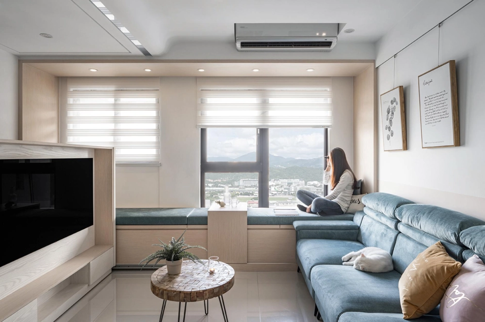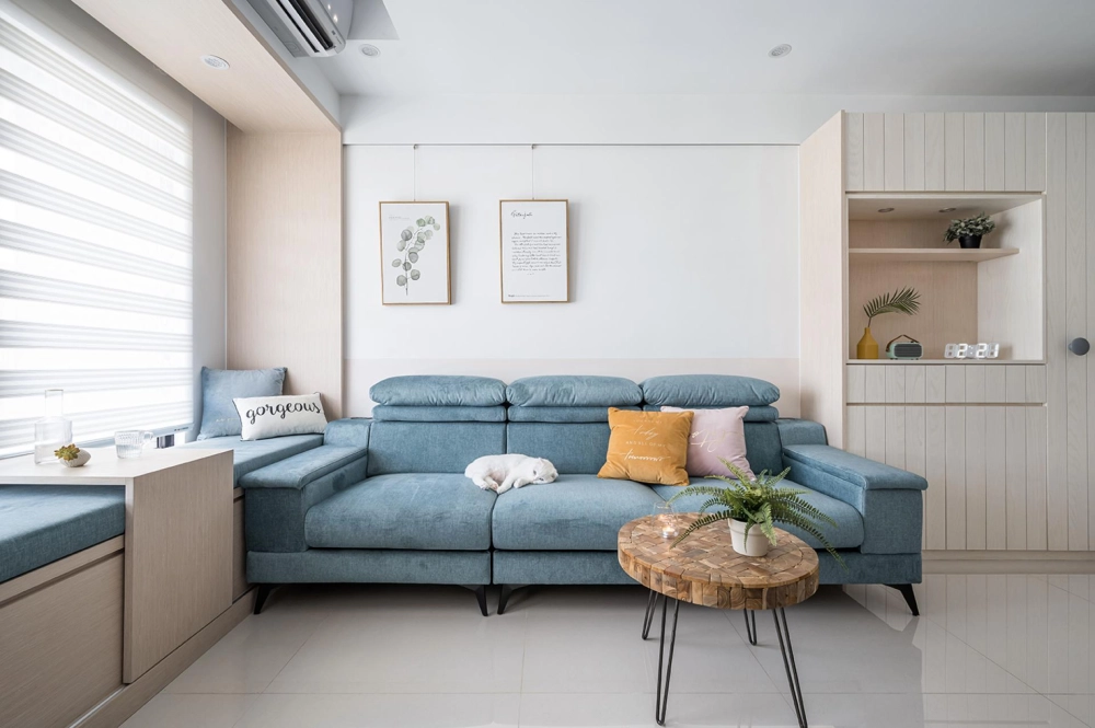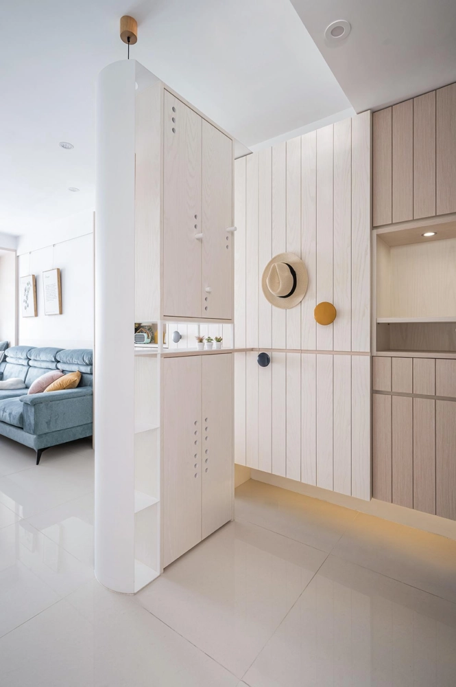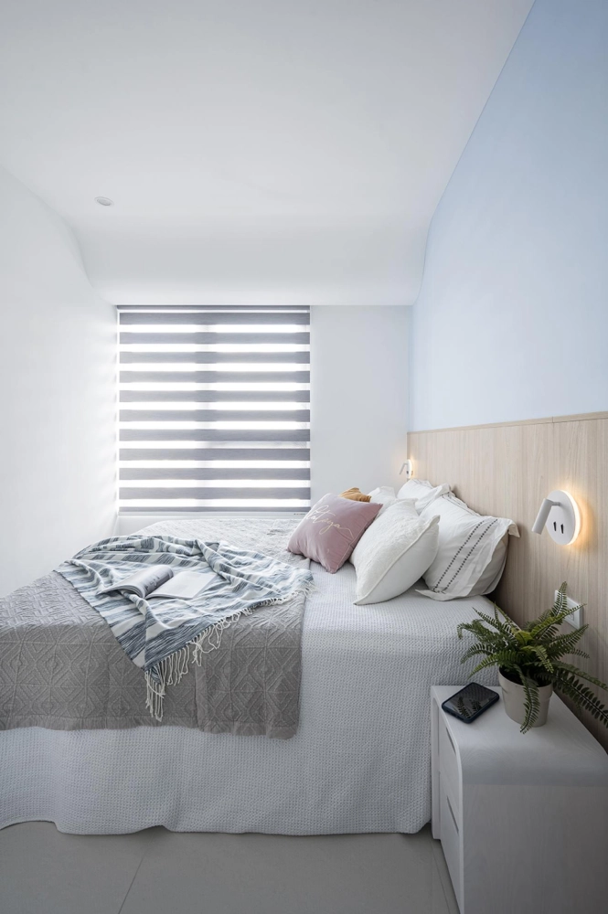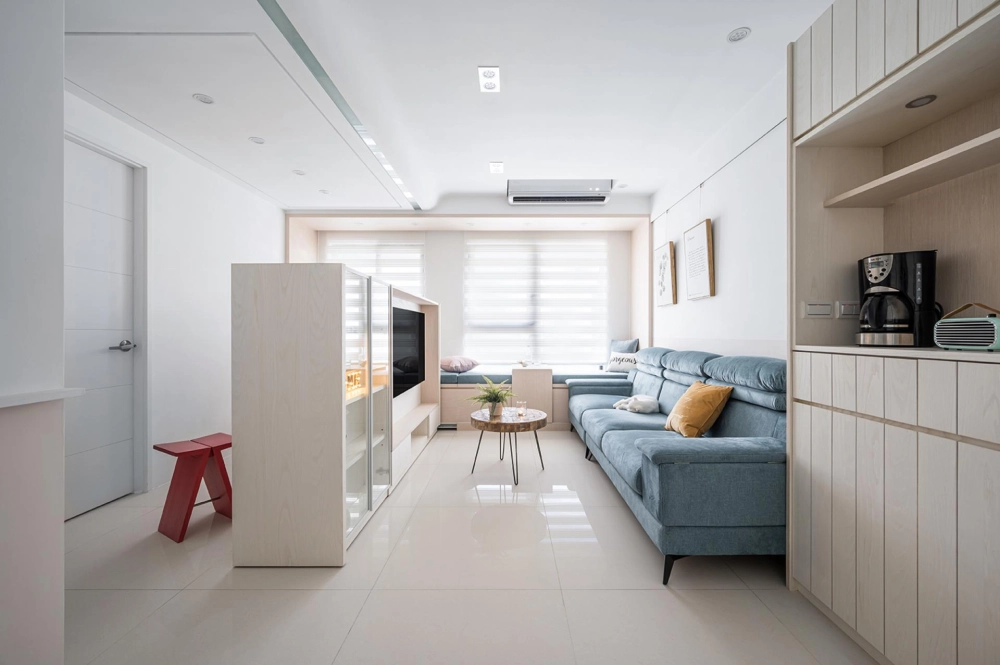 The home is filled with cleverly integrated functions. The secondary bedroom includes a side-lifting bed and desk, making it suitable for reading or as a temporary guest room. In the master bedroom, a triple-sliding wardrobe system makes full use of the space behind structural columns, offering ample storage for large luggage. With hidden features and multifunctional solutions throughout, the space is both richly equipped and visually tidy, perfectly reflecting the homeowners’ vision of “big playfulness in a small home.” The overall aesthetic blends Scandinavian minimalism with vibrant color accents, resulting in a clean yet dynamic visual atmosphere, lively yet orderly.