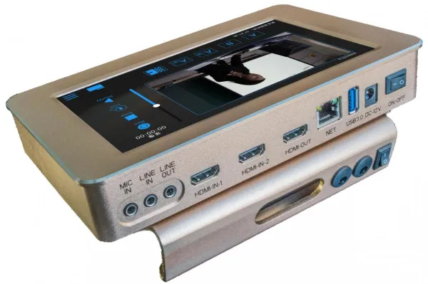 MG2HDMI錄播機是一款2路輸入錄影/直播/導播三能一體的設備。它採用性能更加強大全高畫質影像處理晶片,打造1080P臻美畫質。MG2HDMI錄播機體積小,方便攜帶,介面簡單,架設方便,作為2位元常態化移動錄播,極大的滿足了在教育/會議/培訓/庭審等不同環境的應用。2路HDMI介面輸入,每個介面都支援1080P60影像輸入;1路HDM輸出,可外接大屏顯示器顯示直播畫面或作為輸入源提供給會議終端。MG2HDMI錄播機自帶7吋液晶觸控螢幕,用戶可直接在觸控屏上進行導播/錄影/直播操作;也可以在本地接上滑鼠和顯示器進行操作,並且可以在PC和平板上登錄IE進行遠端導播。這樣一款高度集成的MG2HDMI錄播機,具有易搭建、易攜帶、易操作等特性,除了能滿足攝製團隊製作精品課程視訊外,還能滿足老師獨立操作拍攝微課的需求。
