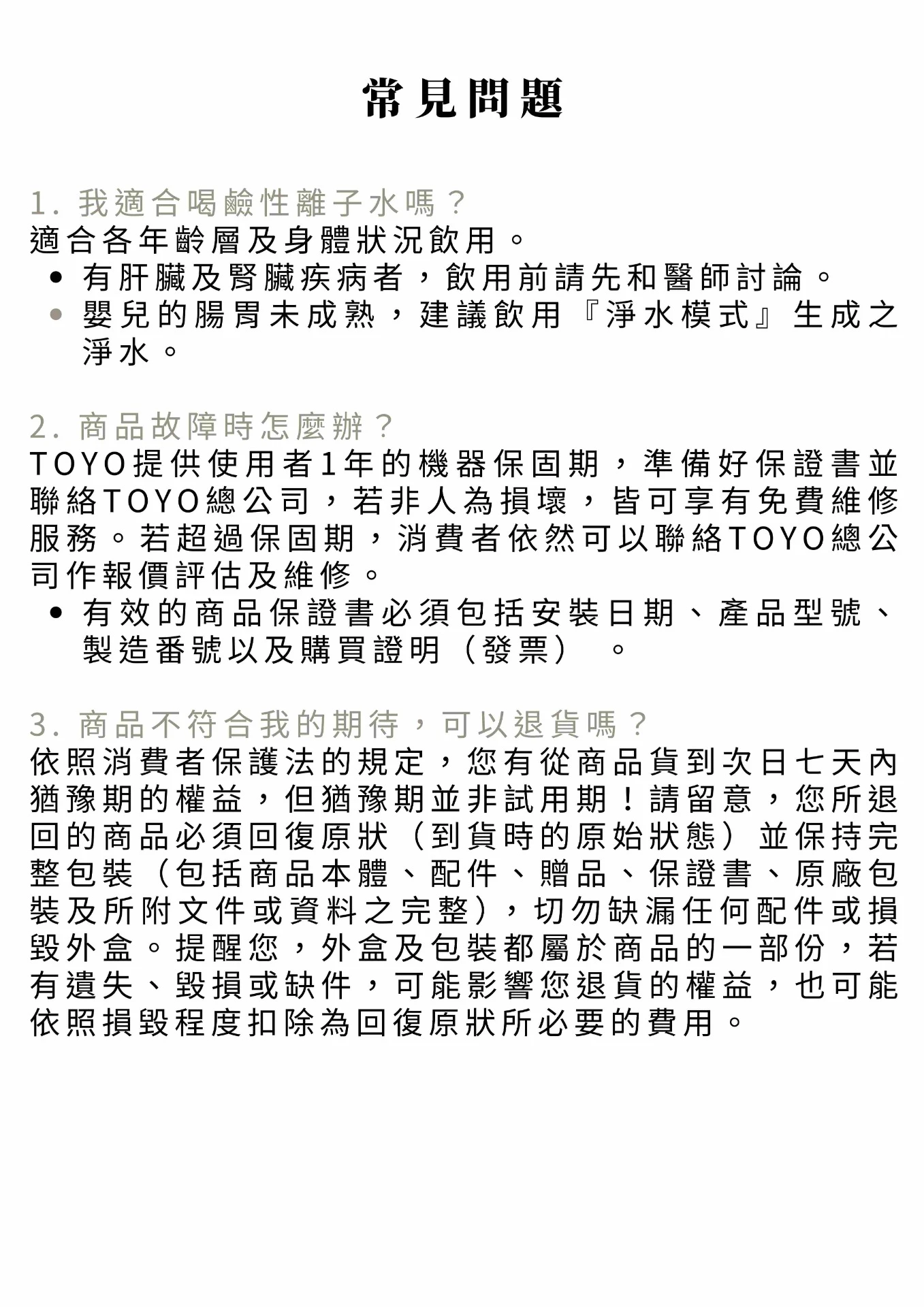 • 除非新品明顯瑕疵(如持續黑水、出水異常),一經安裝過水或拆封,不得退換。