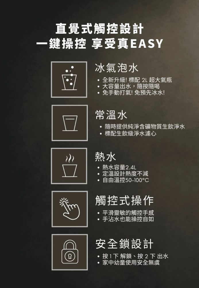 輕按一鍵,享受冰氣泡水、常溫水、熱水