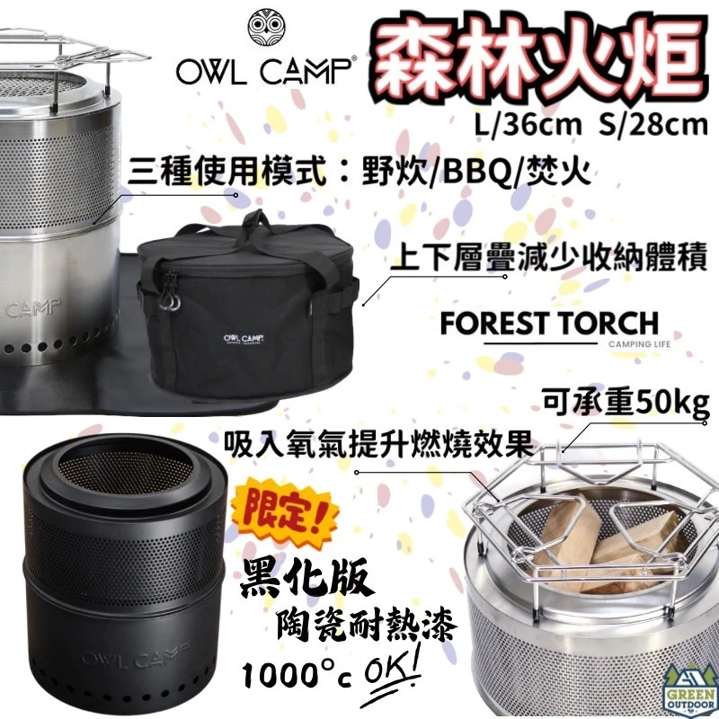 Owl Camp 森林火炬 焚火爐【綠色工場】黑化限定版 升炭器 不鏽鋼炊事火爐 焚火台 附收納袋、防火墊 升火器具