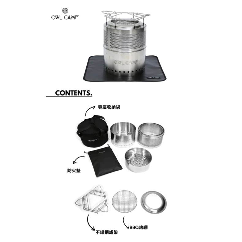 ⭐️內容物: 焚火台本體 、專屬收納袋、爐架、烤網、防火墊