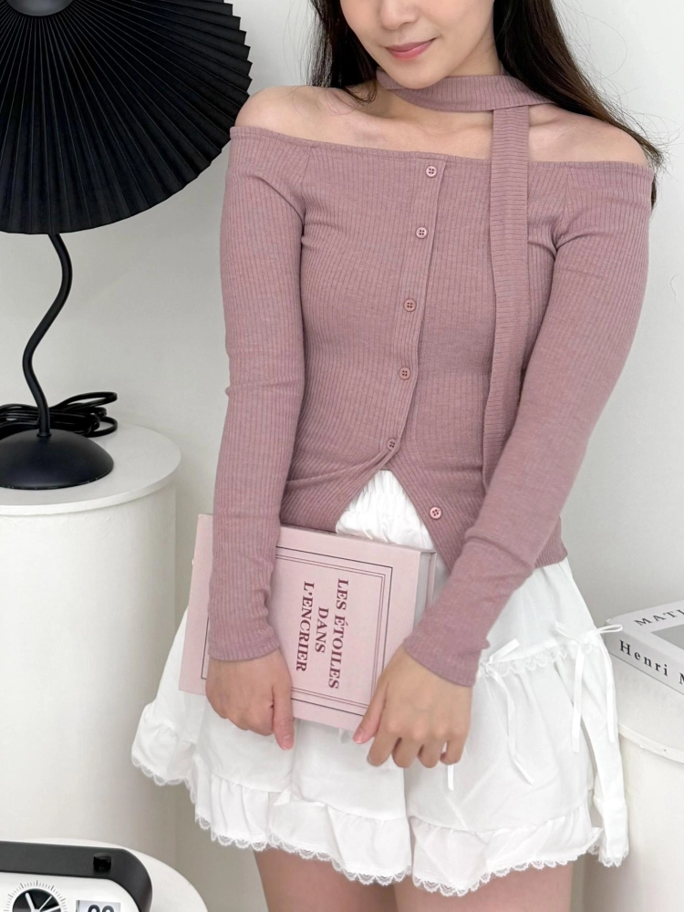 • 正韓平口附圍巾針織排扣套裝