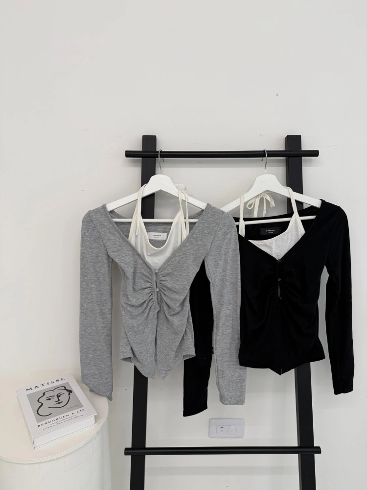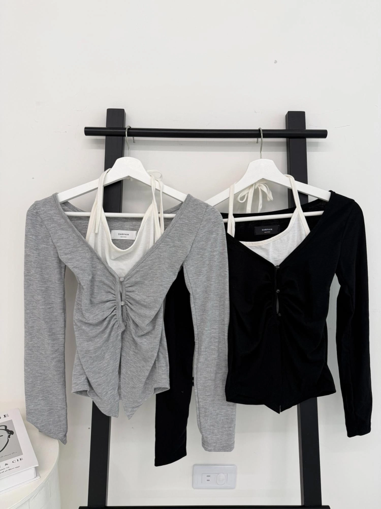 • 正韓假兩件Y2K掛脖褶皺上衣