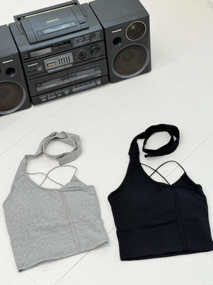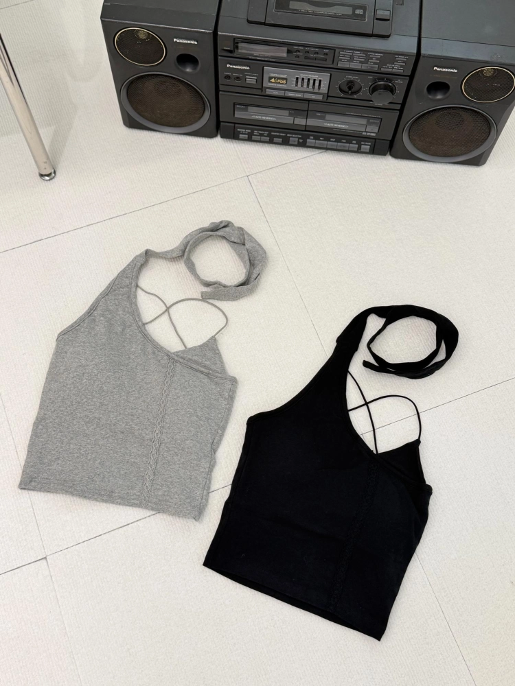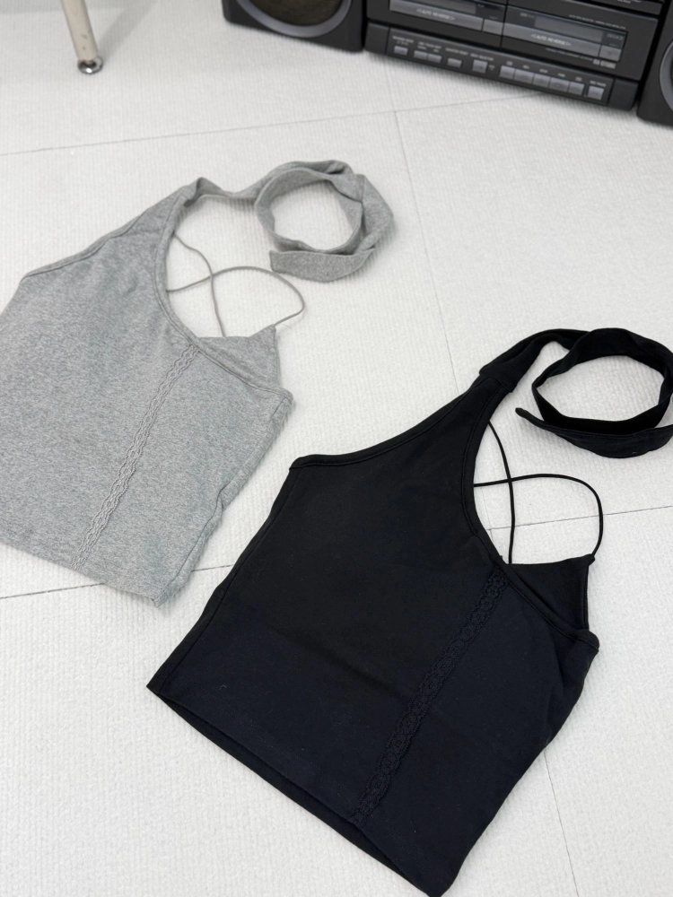 • 拼接蕾絲掛脖露背假兩件上衣(附胸墊