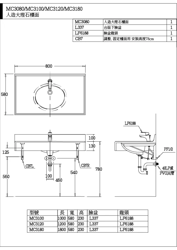 MC3180:1800x580x230mm (雙盆式) / NT$ 23,300
