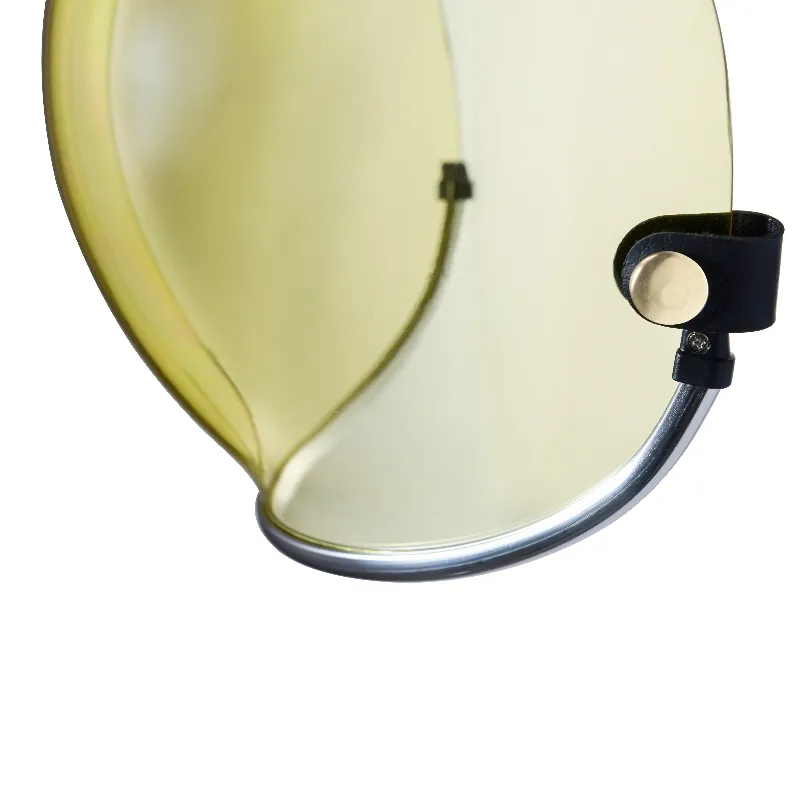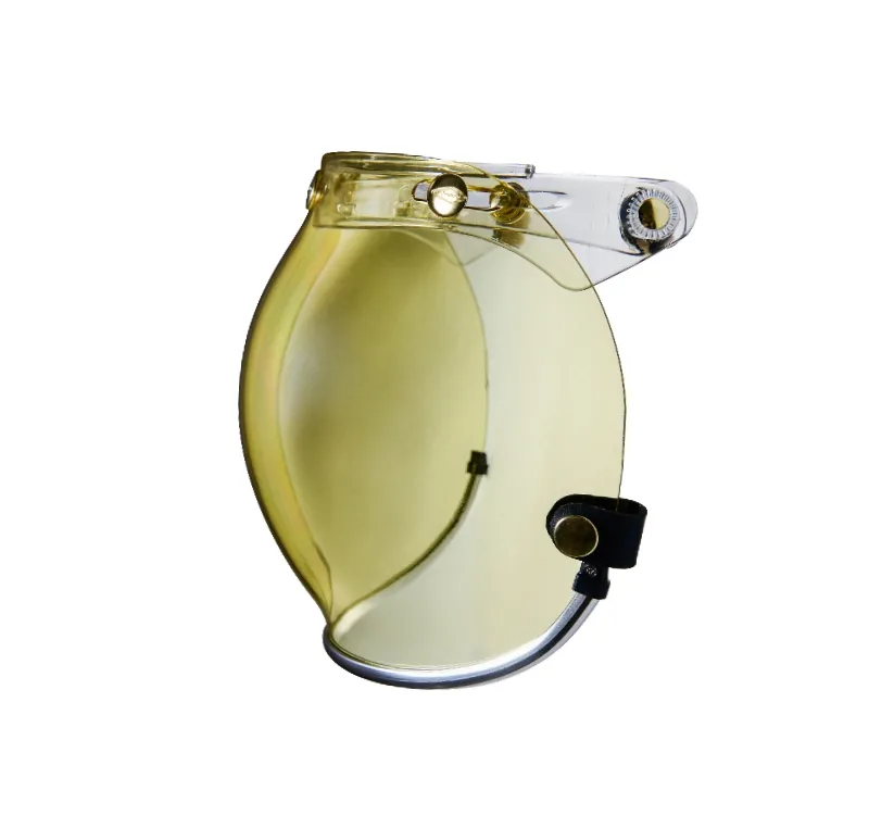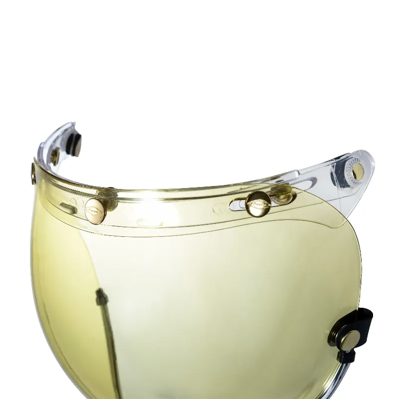 全鏡精銅製黃金色洗光鉚釘,不生鏽,三釦鉚釘雕刻LOGO增加精緻細膩感,強化耐磨抗刮鏡片,曲面塑出成型,可掀可拆設計,抗UV,防冷防風防雨,透視力佳,視野清晰,鏡釦可調整安裝,適用任何三釦標準釦安全帽體。復古車、個性車等車友最愛之風鏡款。