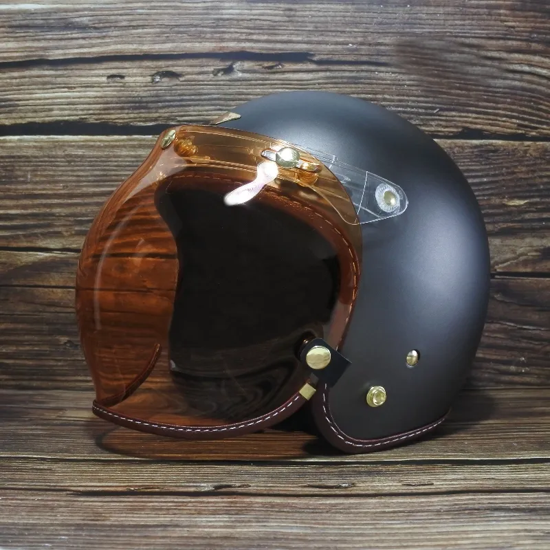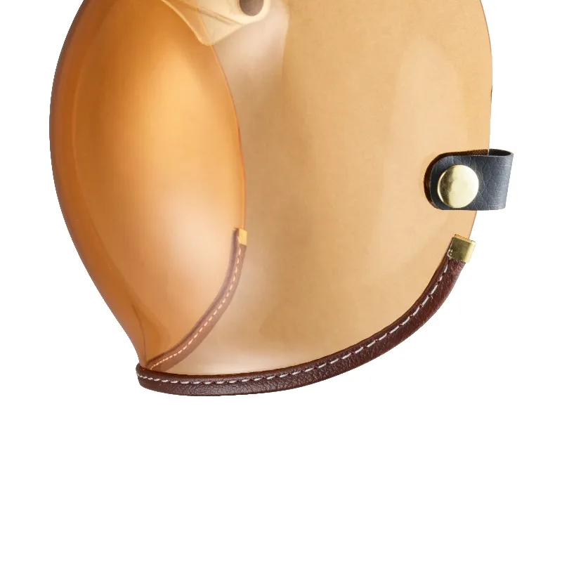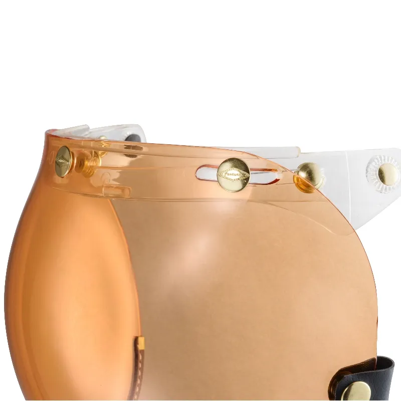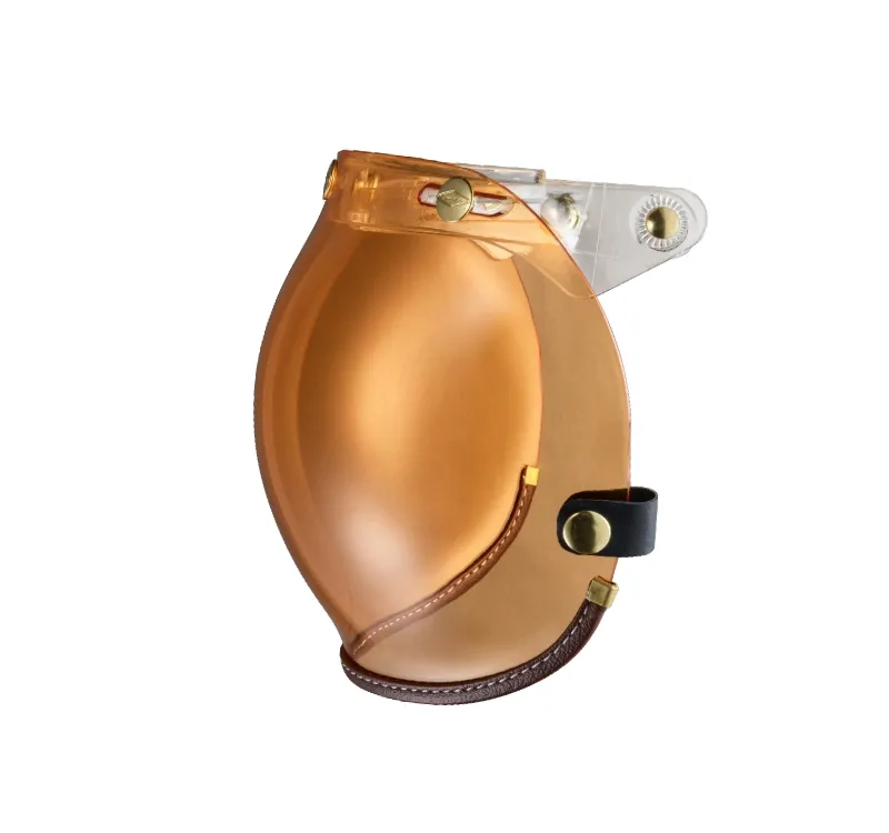 全鏡精銅製黃金色洗光鉚釘,不生鏽,三釦鉚釘雕刻LOGO增加精緻細膩感,強化耐磨抗刮鏡片,曲面塑出成型,可掀可拆設計,抗UV,防冷防風防雨,透視力佳,視野清晰,鏡釦可調整安裝,適用任何三釦標準釦安全帽體。復古車、個性車等車友最愛之風鏡款。