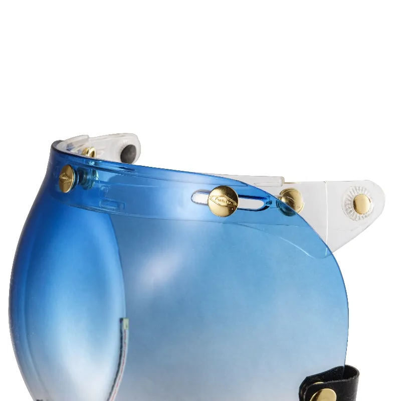 全鏡精銅製黃金色洗光鉚釘,不生鏽,三釦鉚釘雕刻LOGO增加精緻細膩感,強化耐磨抗刮鏡片,曲面塑出成型,可掀可拆設計,抗UV,防冷防風防雨,透視力佳,視野清晰,鏡釦可調整安裝,適用任何三釦標準釦安全帽體。復古車、個性車等車友最愛之風鏡款。