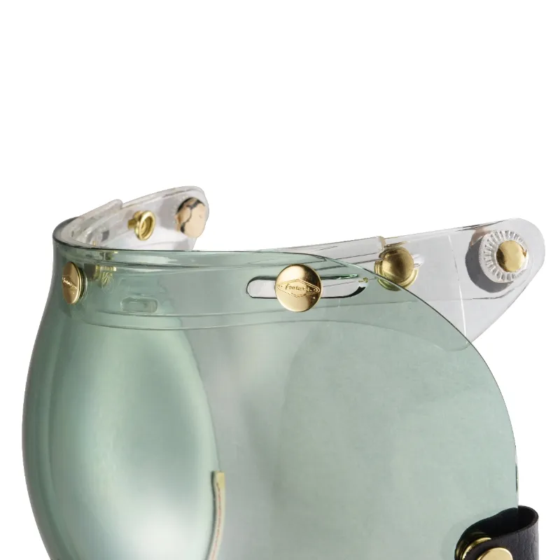 全鏡精銅製黃金色洗光鉚釘,不生鏽,三釦鉚釘雕刻LOGO增加精緻細膩感,強化耐磨抗刮鏡片,曲面塑出成型,可掀可拆設計,抗UV,防冷防風防雨,透視力佳,視野清晰,鏡釦可調整安裝,適用任何三釦標準釦安全帽體。復古車、個性車等車友最愛之風鏡款。