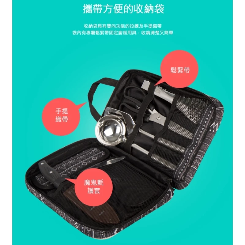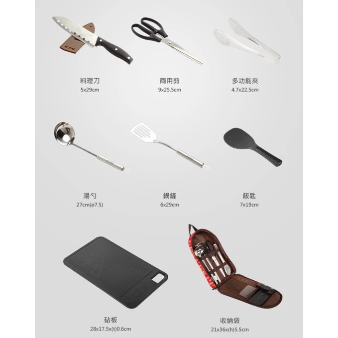 內容物:收納袋、料理刀、食物剪、湯勺、飯匙、多功能夾、煎鏟、沾板