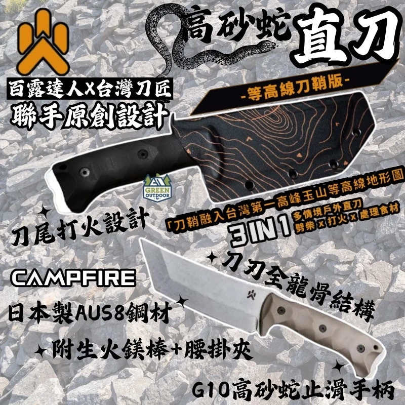 CAMPFIRE 高砂蛇直刀【綠色工場】營火部落 柴刀 求生刀 直刀 戶外刀 小刀 露營刀 野營刀 附生火鎂棒、腰掛夾