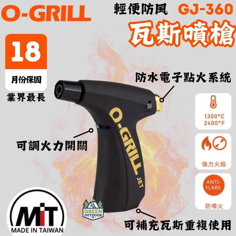 O-Grill 輕便防風瓦斯噴槍【綠色工場】GJ-360 打火機 可回充 電子點火 1300°C藍色火焰 特仕黑