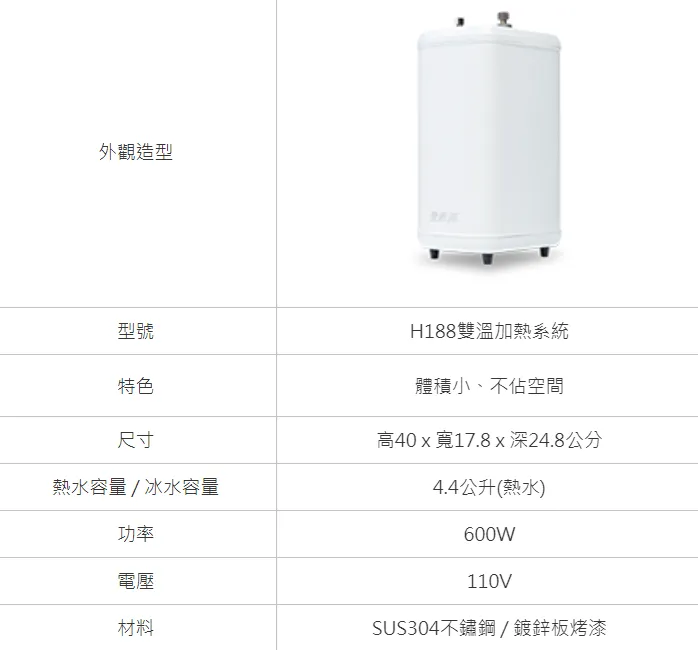 雙溫飲水設備水箱採SUS304不銹鋼;使用110V / 600W之電熱管,加熱速度快。