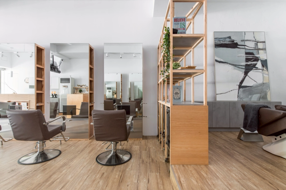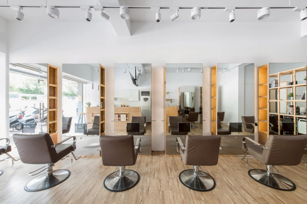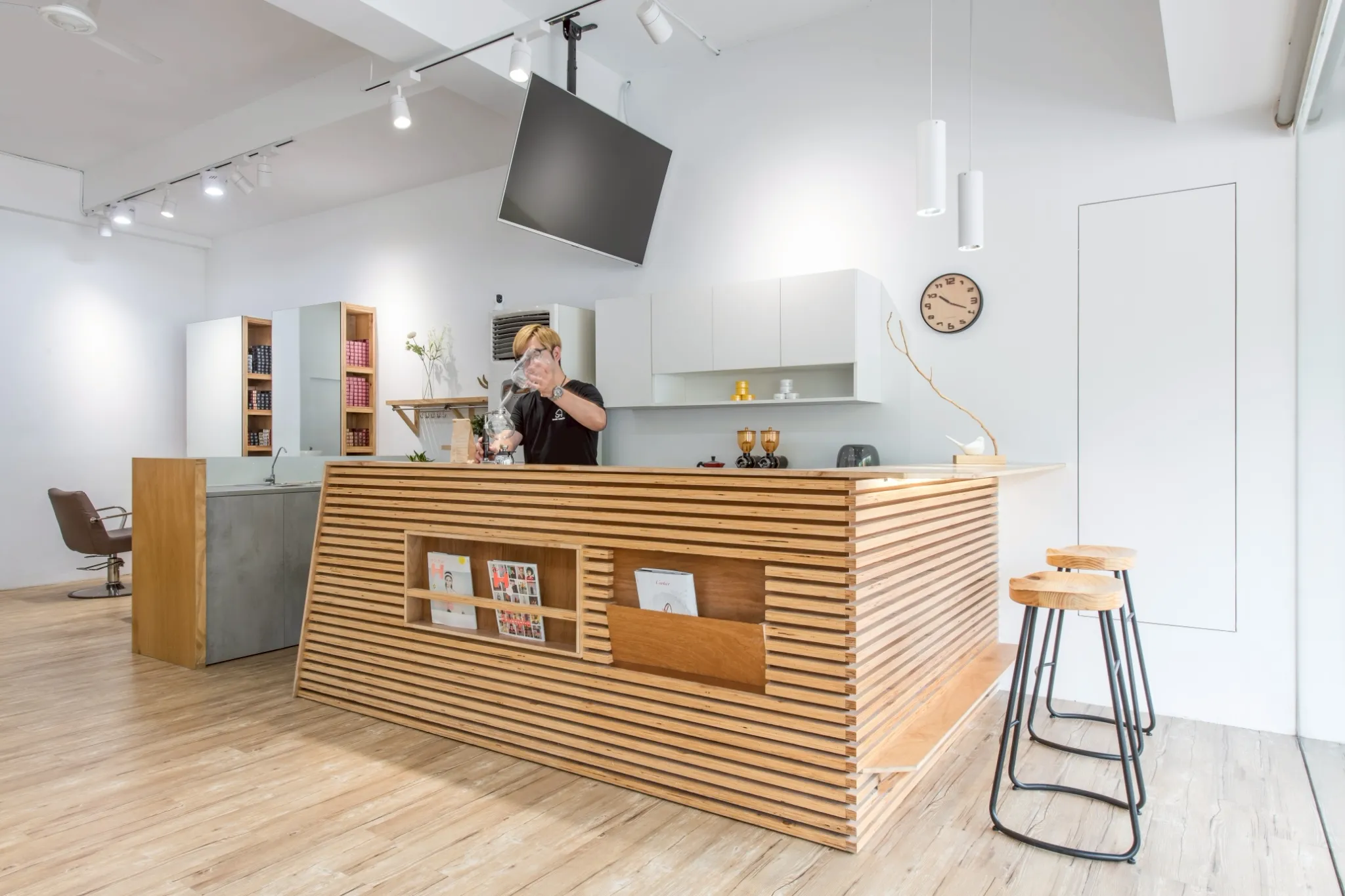 發揮木質的柔韌性及鏡子的投射效應,水設空間室內設計團隊建構虛實交疊的敞亮世界。光影輝映間,由落地窗導入的綠意點綴其中,營塑置身自然的舒放感,洗滌人們疲憊的心靈,注入融融暖流。多功能吧台及鏡面後方植入置物架,取代美髮沙龍使用手推車儲物的習慣,讓動線更流暢,同時擴展了空間視野。當顧客走入此處,不僅能享受美髮服務,更能感受到前所未有的舒暢自在,恍若沐浴流光森林中,經歷了一次減壓療癒的心靈SPA。