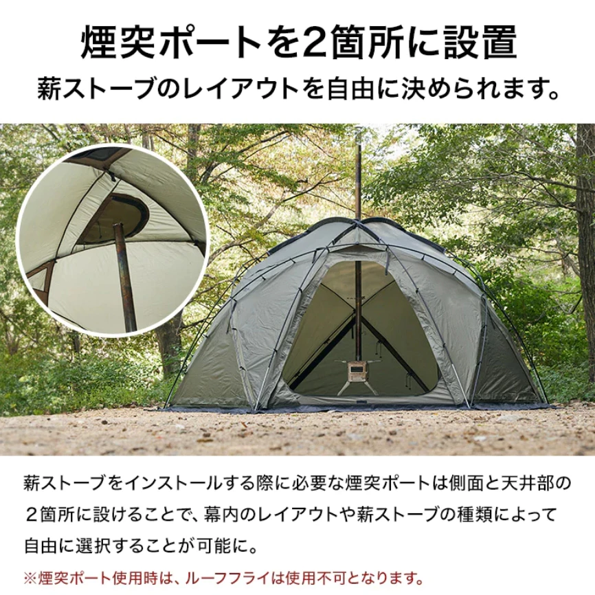 為了安裝木柴爐時需要的煙囪孔,在側面和頂部各設有兩個煙囪孔,可以根據帳篷內部的佈局和木柴爐的類型自由選擇。※使用煙囪孔時,屋頂遮陽篷無法使用。