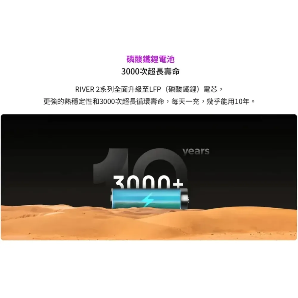 • RIVER 2系列全面升級至LFP(磷酸鐵鋰)電芯,更強的熱穩定性和3000次超長循環壽命,每天一充,幾乎能用10年。